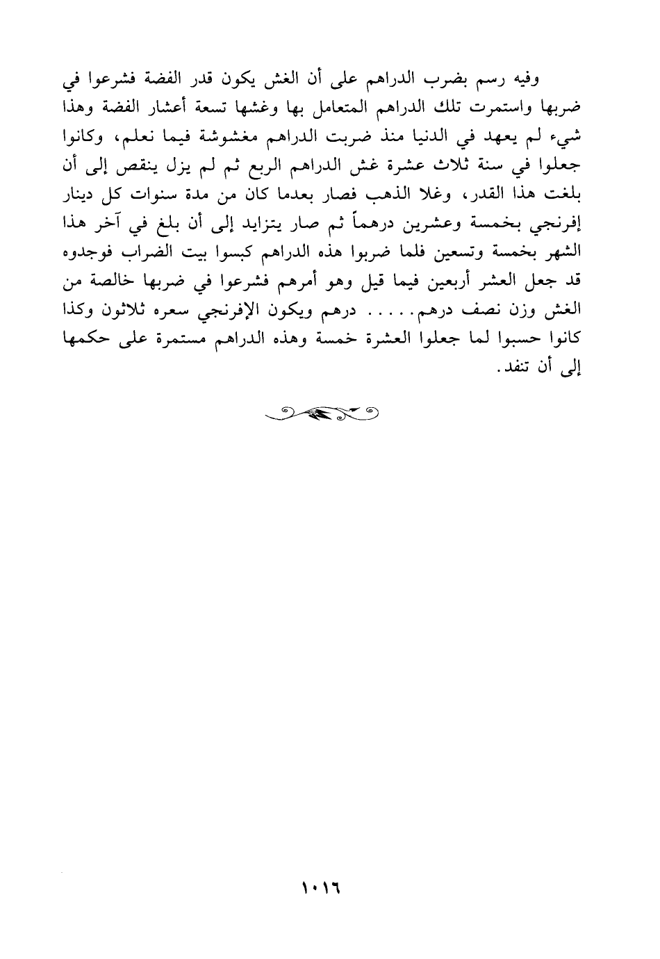 وفيه رسم بضرب الدراهم على أن الغش يكون قدر الفضة فشرعوا في ضربها واستمرت تلك الدراهم المتعامل بها وغشها تسعة أعشار الفضة وهذا شيء لم يعهد في الدنيا منذ ضربت الدراهم مغشوشة فيما نعلم، وكانوا جعلوا في سنة ثلاث عشرة غش الدراهم الربع ثم لم يزل ينقص إلى أن بلغت هذا القدر، وغلا الذهب فصار بعدما كان من مدة سنوات كل دينار إفرنجي بخمسة وعشرين درهمًا ثم صار يتزايد إلى أن بلغ في آخر هذا الشهر بخمسة وتسعين فلما ضربوا هذه الدراهم كبسوا بيت الضراب فوجدوه قد جعل العشر أربعين فيما قيل وهو أمرهم فشرعوا في ضربها خالصة من الغش وزن نصف درهم ..... درهم ويكون الإفرنجي سعره ثلاثون وكذا كانوا حسبوا لما جعلوا العشرة خمسة وهذه الدراهم مستمرة على حكمها إلى أن تنفد.