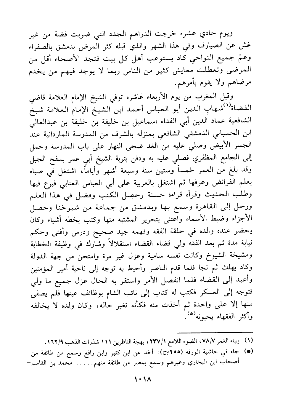 وقبل المغرب من يوم الأربعاء عاشره توفي الشيخ الإمام العلامة قاضي القضاة (¬1) شهاب الدين أبو العباس أحمد ابن الشيخ الإمام العلامة شيخ الشافعية عماد الدين أبي الفداء اسماعيل بن خليفة بن خليفة بن عبد العالي ابن الحسباني الدمشقي الشافعي بمنزله بالشرف من المدرسة الماردانية عند الجسر الأبيض وصلي عليه من الغد ضحى النهار على باب المدرسة وحمل إلى الجامع المظفري فصلي عليه به ودفن بتربة الشيخ أبي عمر بسفح الجبل وقد بلغ من العمر خمسًا وستين سنة وسبعة أشهر وأيامًا، اشتغل في صباه بعلم الفرائض وعرفها ثم اشتغل بالعربية على أبي العباس العنابي فبرع فيها وطلب الحديث وقرأه قراءة حسنة وحصل الكتب وفضل في هذا العلم ورحل إلى القاهرة وسمع بها وبدمشق من جماعة من شيوخنا وحصل الأجزاء وضبط الأسماء واعتنى بتحرير المشتبه منها وكتب بخطه أشياء وكان يحضر عنده والده في حلقة الفقه وفهمه جيد صحيح ودرس وأفتى وحكم نيابة مدة ثم بعد الفقه ولي قضاء القضاء استقلالاً وشارك في وظيفة الخطابة ومشيخة الشيوخ وكانت نفسه سامية وعزل غير مرة وامتحن من جهة الدولة وكاد يهلك ثم نجا فلما قدم الناصر وأحيط به توجه إلى ناحية أمير المؤمنين وأعيد إلى القضاء فلما انفصل الأمر واستقر به الحال عزل جميع ما ولي فتوجه إلى العسكر فكتب له كتاب إلى نائب الشام بوظائف عينها فلم يصفى منها إلا على واحدة ثم أخذت منه فكأنه تغير حاله، وكان ولده لا يخالفه وأكثر الفقهاء يحبونه (*).