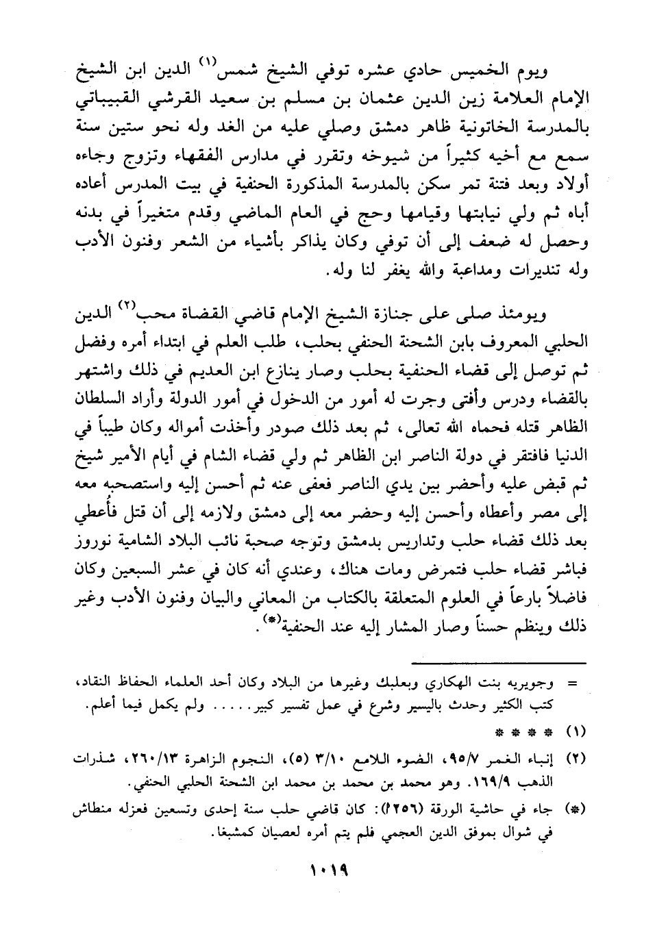 (¬2) إنباء الغمر 7/ 95، الضوء اللامع 10/ 3 (5)، النجوم الزاهرة 13/ 260، شذرات الذهب 9/ 169. وهو محمد بن محمد بن محمد ابن الشحنة الحلبي الحنفي.