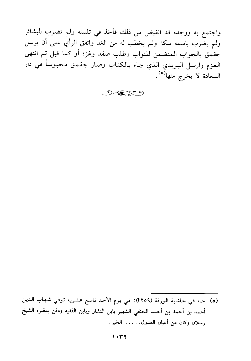 (*) جاء في حاشية الورقة (259 أ): في يوم الأحد تاسع عشريه توفي شهاب الدين أحمد بن أحمد بن أحمد الحنفي الشهير بابن النشار وبابن الفقيه ودفن بمقبره الشيخ رسلان وكان من أعيان العدول ..... الخير.