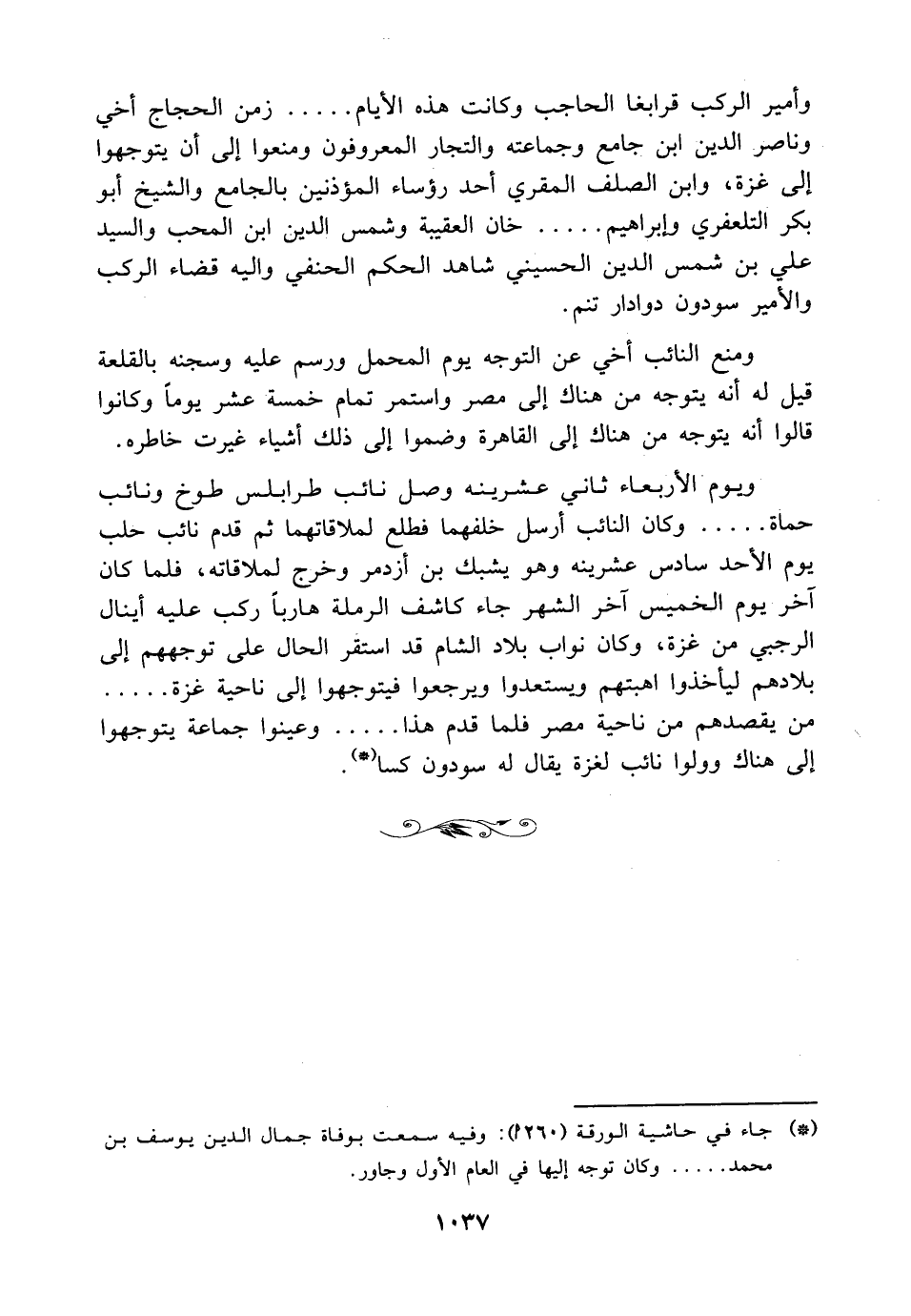 ويوم الأربعاء ثاني عشرينه وصل نائب طرابلس طوخ ونائب حماة ..... وكان النائب أرسل خلفهما فطلع لملاقاتهما ثم قدم نائب حلب يوم الأحد سادس عشرينه وهو يشبك بن أزدمر وخرج لملاقاته، فلما كان آخر يوم الخميس آخر الشهر جاء كاشف الرملة هاربًا ركب عليه أينال الرجبي من غزة، وكان نواب بلاد الشام قد استقر الحال على توجههم إلى بلادهم ليأخذوا اهبتهم ويستعدوا ويرجعوا فيتوجهوا إلى ناحية غزة ..... من يقصدهم من ناحية مصر فلما قدم هذا ..... وعينوا جماعة يتوجهوا إلى هناك وولوا نائب لغزة يقال له سودون كسا (*).