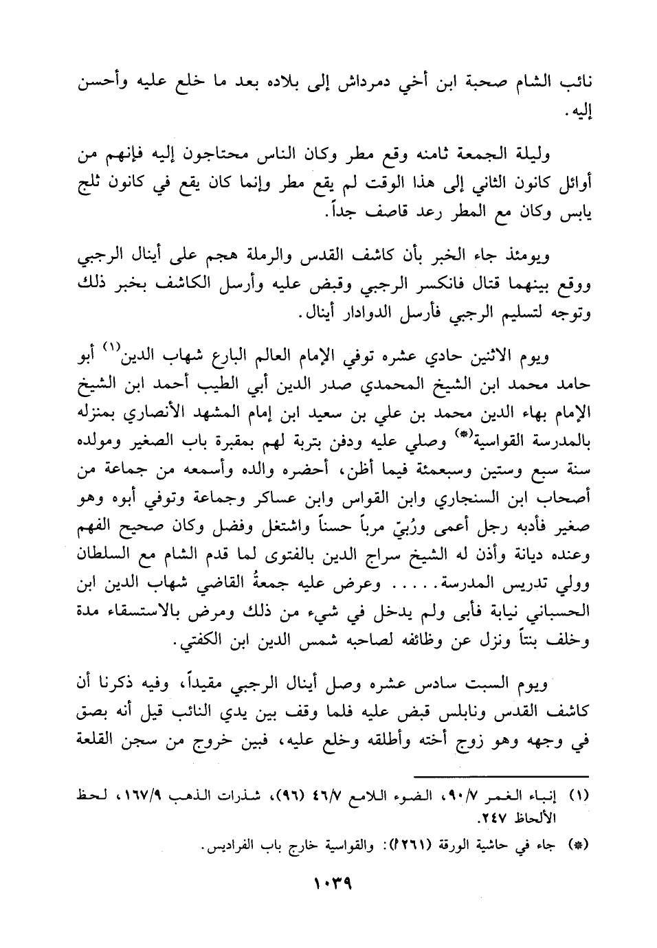 ويومئذ جاء الخبر بأن كاشف القدس والرملة هجم على أينال الرجبي ووقع بينهما قتال فانكسر الرجبي وقبض عليه وأرسل الكاشف بخبر ذلك وتوجه لتسليم الرجبي فأرسل الدوادار أينال.