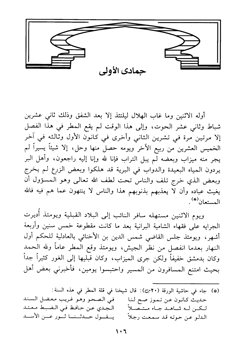 أوله الاثنين وما غاب الهلال ليلتئذ إلا بعد الشفق وذلك ثاني عشرين شباط وثاني عشر الحوت، وإلى هذا الوقت لم يقع المطر في هذا الفصل إلا مرتين مرة في تشرين الثاني وأخرى في كانون الأول وثالثه في آخر الخميس العشرين من ربيع الآخر ويومه حصل منها وحل، إلا شيئاً يسيراً لم يجر منه ميزاب وبعضه لم يبل التراب فإنا لله وإنا إليه راجعون، وأهل البر يردون المياه البعيدة والدواب في البرية قد هلكوا وبعض الزرع لم يخرج وبعض الذي خرج تلف والناس تحت لطف الله تعالى وهو المسؤول أن يغيث عباده وأن لا يعذبهم بذنوبهم هذا والناس لا ينتهون عما هم فيه فالله المستعان (*).