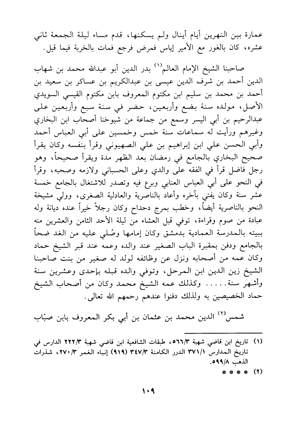 صاحبنا الشيخ الإمام العالم (¬1) بدر الدين أبو عبد الله محمد بن شهاب الدين أحمد بن شرف الدين عيسى بن عبد الكريم بن عساكر بن سعيد بن أحمد بن محمد بن سليم ابن مكتوم المعروف بابن مكتوم القيسي السويدي الأصل، مولده سنة بضع وأربعين، حضر في سنة سبع وأربعين على عبد الرحيم بن أبي اليسر وسمع من جماعة من شيوخنا أصحاب ابن البخاري وغيرهم ورأيت له سماعات سنة خمس وخمسين على أبي العباس أحمد وأبي الحسن علي ابن إبراهيم بن علي الصهيوني وقرأ بنفسه وكان يقرأ صحيح البخاري بالجامع في رمضان بعد الظهر مدة ويقرأ صحيحًا، وهو رجل فاضل قرأ في الفقه على والدي وعلى الحسباني ولازمه وصحبه، وقرأ في النحو على أبي العباس العنابي وبرع فيه وتصدر للاشتغال بالجامع خمسة عشر سنة وكان يفتي بآخره وأعاد بالناصرية والعادلية الصغرى، وولي مشيخة النحو بالناصرية أيضًا، وخطب بمرج دحداح وكان رجلًا خيرًا عنده ديانة وله عبادة من صوم وقراءة، توفي قبل العشاء من ليلة الأحد الثامن والعشرين منه ببيته بالمدرسة العمادية بدمشق وكان إمامها وصُلي عليه من الغد ضحًا بالجامع ودفن بمقبرة الباب الصغير عند والده وعمه عند قبر الشيخ حماد وكان عمه من أصحابه ونزل عن وظائفه لولد له صغير من بنت صاحبنا الشيخ زين الدين ابن المرحل، وتوفي والده قبله بإحدى وعشرين سنة وأشهر سنة ..... وكذلك عمه الشيخ محمد وكان من أصحاب الشيخ حماد الخصيصين به ولذلك دفنوا عندهم رحمهم الله تعالى.