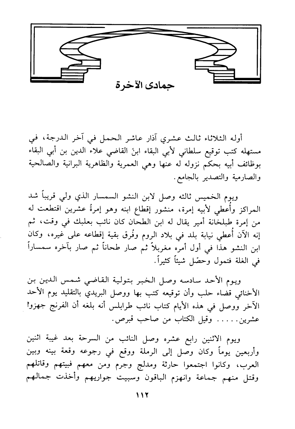 ويوم الأحد سادسه وصل الخبر بتولية القاضي شمس الدين بن الأخنائي قضاء حلب وأن توقيعه كتب بها ووصل البريدي بالتقليد يوم الأحد الآخر ووصل في هذه الأيام كتاب نائب طرابلس أنه بلغه أن الفرنج جهزوا عشرين ..... وقيل الكتاب من صاحب قبرص.