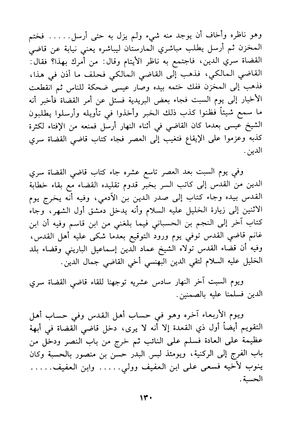 وفي يوم السبت بعد العصر تاسع عشره جاء كتاب قاضي القضاة سري الدين من القدس إلى كاتب السر بخبر قدوم تقليده القضاء مع بقاء خطابة القدس بيده وجاء كتاب إلى صدر الدين بن الآدمي، وفيه أنه يخرج يوم الاثنين إلى زيارة الخليل عليه السلام وأنه يدخل دمشق أول الشهر، وجاء كتاب آخر إلى النجم بن الحسباني فيما بلغني من ابن قاسم وفيه أن ابن غانم قاضي القدس توفي يوم ورود التوقيع بعدما شكى عليه أهل القدس، وفيه أن قضاء القدس تولاه الشيخ عماد الدين إسماعيل الباريني وقضاء بلد الخليل عليه السلام لتقي الدين البهنسي أخي القاضي جمال الدين.