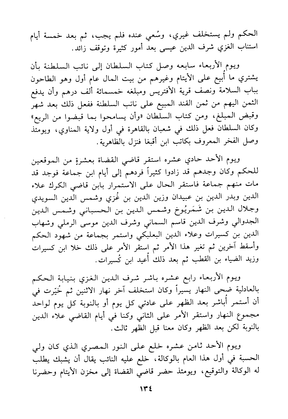 ويوم الأربعاء رابع عشره باشر شرف الدين الغزي بنيابة الحكم بالعادلية ضحى النهار يسيراً وكان استخلف آخر نهار الاثنين ثم خُيّرت في أن أستمر أُباشر بعد الظهر على عادتي كل يوم أو بالنوبة كل يوم لواحد مجموع النهار واستقر الأمر على الثاني وكنا في أيام القاضي علاء الدين بالنوبة لكن بعد الظهر وكان معنا قبل الظهر ثالث.