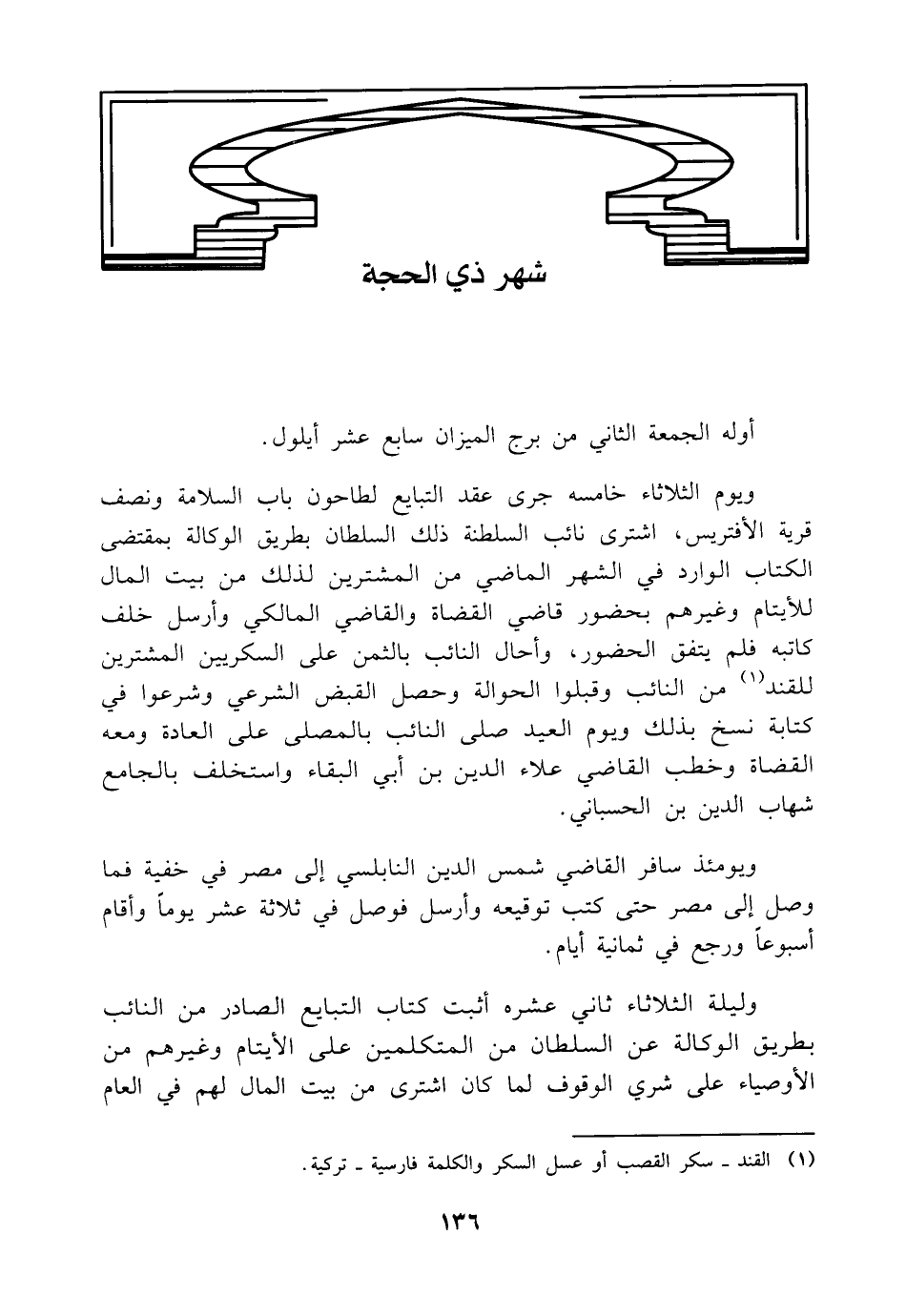 ويوم الثلاثاء خامسه جرى عقد التبايع لطاحون باب السلامة ونصف قرية الأفتريس، اشترى نائب السلطنة ذلك السلطان بطريق الوكالة بمقتضى الكتاب الوارد في الشهر الماضي من المشترين لذلك من بيت المال للأيتام وغيرهم بحضور قاضي القضاة والقاضي المالكي وأرسل خلف كاتبه فلم يتفق الحضور، وأحال النائب بالثمن على السكريين المشترين للقند (¬1) من النائب وقبلوا الحوالة وحصل القبض الشرعي وشرعوا في كتابة نسخ بذلك ويوم العيد صلى النائب بالمصلى على العادة ومعه القضاة وخطب القاضي علاء الدين بن أبي البقاء واستخلف بالجامع شهاب الدين بن الحسباني.