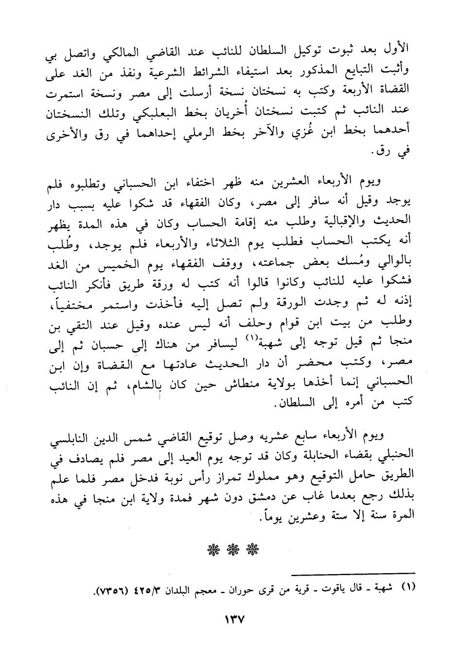 ويوم الأربعاء العشرين منه ظهر اختفاء ابن الحسباني وتطلبوه فلم يوجد وقيل أنه سافر إلى مصر، وكان الفقهاء قد شكوا عليه بسبب دار الحديث والإقبالية وطلب منه إقامة الحساب وكان في هذه المدة يظهر أنه يكتب الحساب فطلب يوم الثلاثاء والأربعاء فلم يوجد، وطُلب بالوالي ومُسك بعض جماعته، ووقف الفقهاء يوم الخميس من الغد فشكوا عليه للنائب وكانوا قالوا أنه كتب له ورقة طريق فأنكر النائب إذنه له ثم وجدت الورقة ولم تصل إليه فأخذت واستمر مختفيًا، وطلب من بيت ابن قوام وحلف أنه ليس عنده وقيل عند التقي بن منجا ثم قيل توجه إلى شهبة (¬1) ليسافر من هناك إلى حسبان ثم إلى مصر، وكتب محضر أن دار الحديث عادتها مع القضاة وإن ابن الحسباني إنما أخذها بولاية منطاش حين كان بالشام، ثم إن النائب كتب من أمره إلى السلطان.