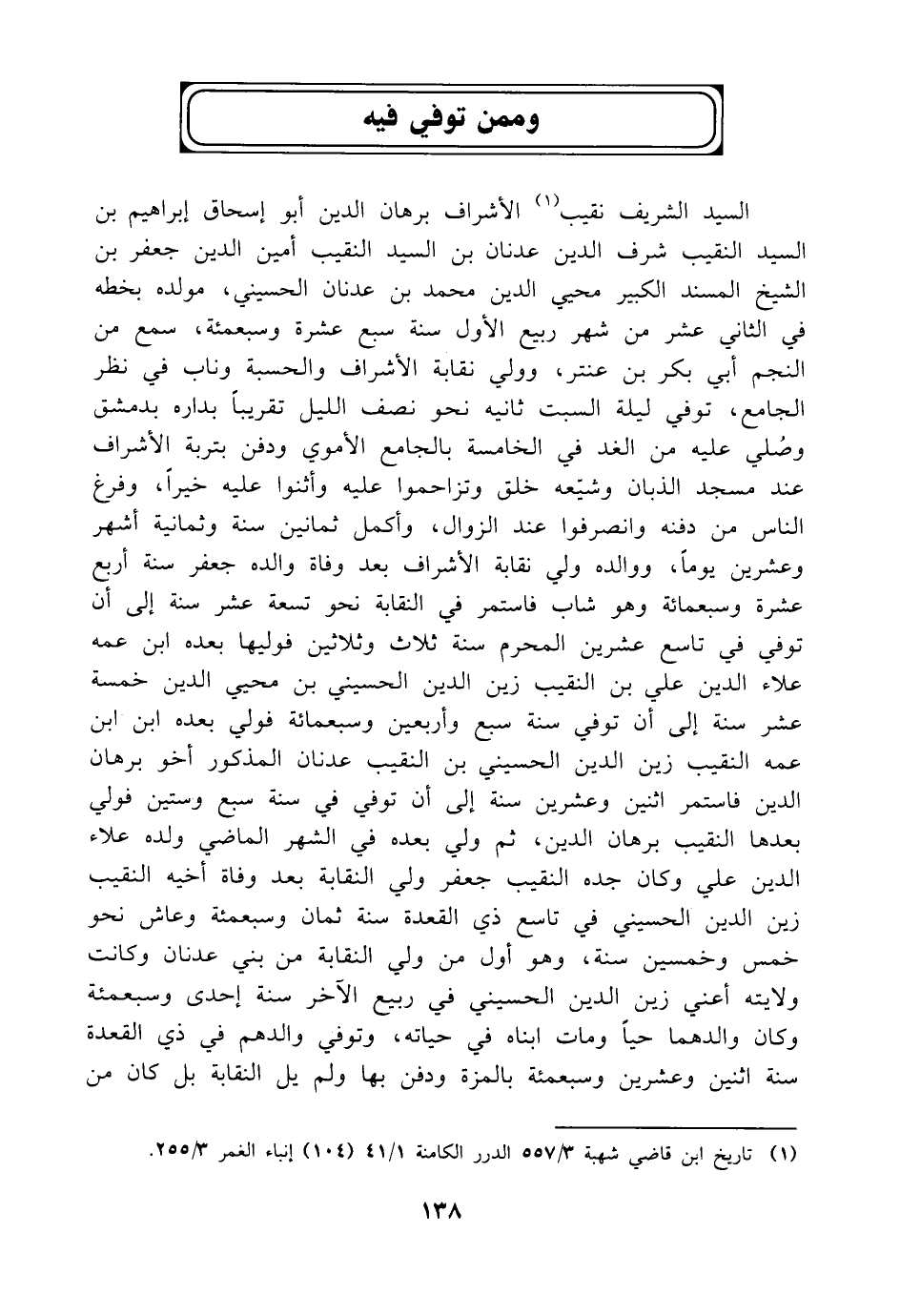 السيد الشريف نقيب (¬1) الأشراف برهان الدين أبو إسحاق إبراهيم بن السيد النقيب شرف الدين عدنان بن السيد النقيب أمين الدين جعفر بن الشيخ المسند الكبير محيي الدين محمد بن عدنان الحسيني، مولده بخطه في الثاني عشر من شهر ربيع الأول سنة سبع عشرة وسبعمئة، سمع من النجم أبي بكر بن عنتر، وولي نقابة الأشراف والحسبة وناب في نظر الجامع، توفي ليلة السبت ثانيه نحو نصف الليل تقريبًا بداره بدمشق وصُلي عليه من الغد في الخامسة بالجامع الأموي ودفن بتربة الأشراف عند مسجد الذبان وشيّعه خلق وتزاحموا عليه وأثنوا عليه خيرًا، وفرغ الناس من دفنه وانصرفوا عند الزوال، وأكمل ثمانين سنة وثمانية أشهر وعشرين يومًا، ووالده ولي نقابة الأشراف بعد وفاة والده جعفر سنة أربع عشرة وسبعمائة وهو شاب فاستمر في النقابة نحو تسعة عشر سنة إلى أن توفي في تاسع عشرين المحرم سنة ثلاث وثلاثين فوليها بعده ابن عمه علاء الدين علي بن النقيب زين الدين الحسيني بن محيي الدين خمسة عشر سنة إلى أن توفي سنة سبع وأربعين وسبعمائة فولي بعده ابن ابن عمه النقيب زين الدين الحسيني بن النقيب عدنان المذكور أخو برهان الدين فاستمر اثنين وعشرين سنة إلى أن توفي في سنة سبع وستين فولي بعدها النقيب برهان الدين، ثم ولي بعده في الشهر الماضي ولده علاء الدين علي وكان جده النقيب جعفر ولي النقابة بعد وفاة أخيه النقيب زين الدين الحسيني في تاسع ذي القعدة سنة ثمان وسبعمئة وعاش نحو خمس وخمسين سنة، وهو أول من ولي النقابة من بني عدنان وكانت ولايته أعني زين الدين الحسيني في ربيع الآخر سنة إحدى وسبعمئة وكان والدهما حيًا ومات ابناه في حياته، وتوفي والدهم في ذي القعدة سنة اثنين وعشرين وسبعمئة بالمزة ودفن بها ولم يل النقابة بل كان من