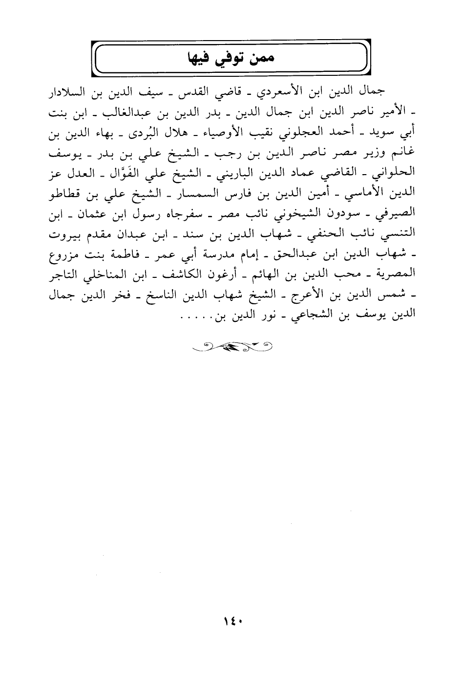 جمال الدين ابن الأسعردي - قاضي القدس - سيف الدين بن السلادار - الأمير ناصر الدين ابن جمال الدين - بدر الدين بن عبد الغالب - ابن بنت أبي سويد - أحمد العجلوني نقيب الأوصياء - هلال البُردى - بهاء الدين بن غانم وزير مصر ناصر الدين بن رجب - الشيخ علي بن بدر - يوسف الحلواني - القاضي عماد الدين الباريني - الشيخ علي الفَوَّال - العدل عز الدين الأماسي - أمين الدين بن فارس السمسار - الشيخ علي بن قطاطو الصيرفي - سودون الشيخوني نائب مصر - سفرجاه رسول ابن عثمان - ابن التنسي نائب الحنفي - شهاب الدين بن سند - ابن عبدان مقدم بيروت - شهاب الدين ابن عبد الحق - إمام مدرسة أبي عمر - فاطمة بنت مزروع المصرية - محب الدين بن الهائم - أرغون الكاشف - ابن المناخلي التاجر - شمس الدين بن الأعرج - الشيخ شهاب الدين الناسخ - فخر الدين جمال الدين يوسف بن الشجاعي - نور الدين بن .....