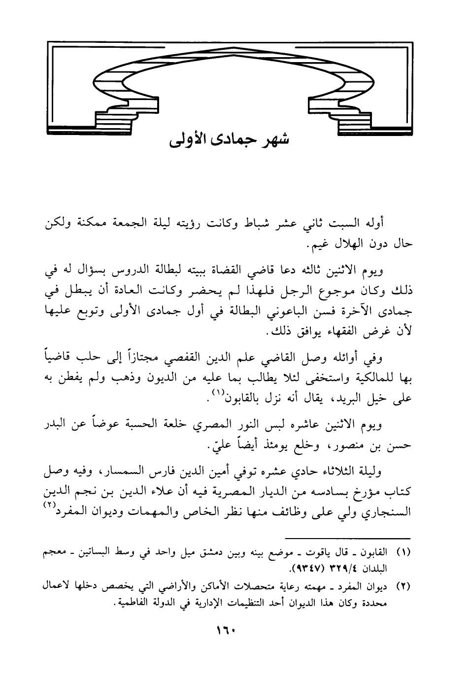 وليلة الثلاثاء حادي عشره توفي أمين الدين فارس السمسار، وفيه وصل كتاب مؤرخ بسادسه من الديار المصرية فيه أن علاء الدين بن نجم الدين السنجاري ولي على وظائف منها نظر الخاص والمهمات وديوان المفرد (¬2)