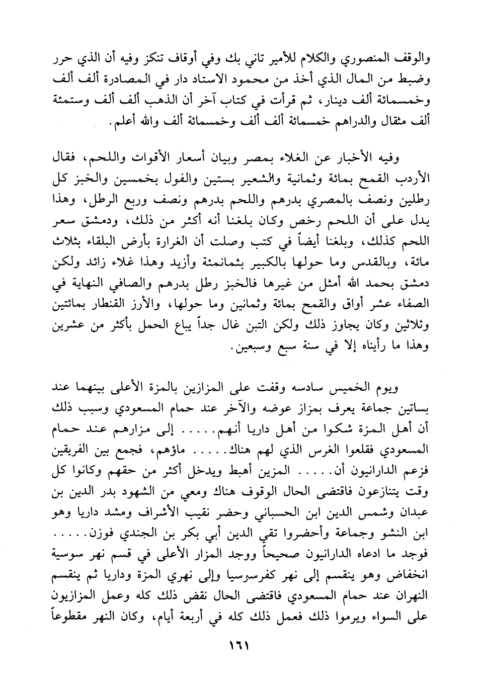 وفيه الأخبار عن الغلاء بمصر وبيان أسعار الأقوات واللحم، فقال الأردب القمح بمائة وثمانية ولمشعير بستين والفول بخمسين والخبز كل رطلين ونصف بالمصري بدرهم واللحم بدرهم ونصف وربع الرطل، وهذا يدل على أن اللحم رخص وكان بلغنا أنه أكثر من ذلك، ودمشق سعر اللحم كذلك، وبلغنا أيضاً في كتب وصلت أن الغرارة بأرض البلقاء بثلاث مائة، وبالقدس وما حولها بالكبير بثمانمئة وأزيد وهذا غلاء زائد ولكن دمشق بحمد الله أمثل من غيرها فالخبز رطل بدرهم والصافي النهاية في الصفاء عشر أواق والقمح بمائة وثمانين وما حولها، والأرز القنطار بمائتين وثلاثين وكان يجاوز ذلك ولكن التبن غال جداً يباع الحمل بأكثر من عشرين وهذا ما رأيناه إلا في سنة سبع وسبعين.