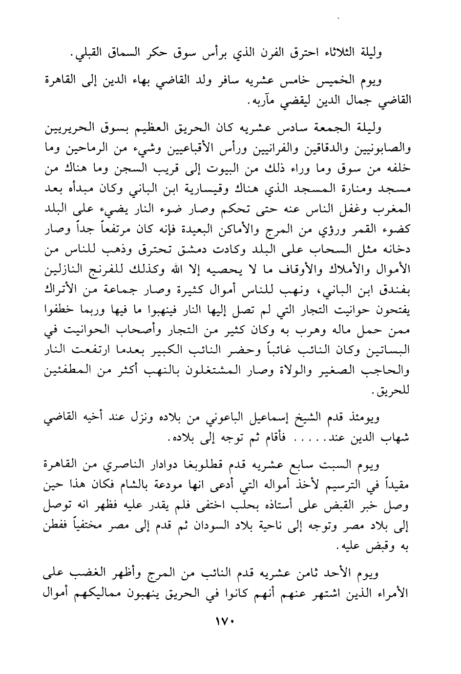وليلة الجمعة سادس عشريه كان الحريق العظيم بسوق الحريريين والصابونيين والدقاقين والفرانيين ورأس الأقباعيين وشيء من الرماحين وما خلفه من سوف وما وراء ذلك من البيوت إلى قريب السجن وما هناك من مسجد ومنارة المسجد الذي هناك وقيسارية ابن الباني وكان مبدأه بعد المغرب وغفل الناس عنه حتى تحكم وصار ضوء النار يضيء على البلد كضوء القمر ورؤي من المرج والأماكن البعيدة فإنه كان مرتفعاً جداً وصار دخانه مثل السحاب على البلد وكادت دمشق تحترق وذهب للناس من الأموال والأملاك والأوقاف ما لا يحصيه إلا الله وكذلك للفرنج النازلين بفندق ابن الباني، ونهب للناس أموال كثيرة وصار جماعة من الأتراك يفتحون حوانيت التجار التي لم تصل إليها النار فينهبوا ما فيها وربما خطفوا ممن حمل ماله وهرب به وكان كثير من التجار وأصحاب الحوانيت في البساتين وكان النائب غائباً وحضر النائب الكبير بعدما ارتفعت النار والحاجب الصغير والولاة وصار المشتغلون بالنهب أكثر من المطفئين للحريق.