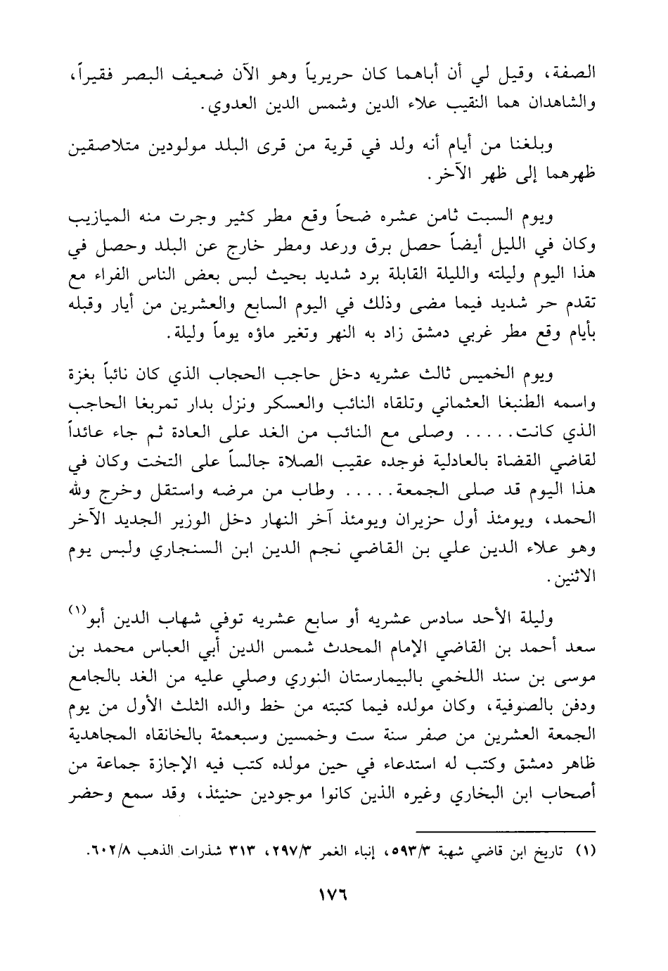 ويوم السبت ثامن عشره ضحاً وقع مطر كثير وجرت منه الميازيب وكان في الليل أيضاً حصل برق ورعد ومطر خارج عن البلد وحصل في هذا اليوم وليلته والليلة القابلة برد شديد بحيث لبس بعض الناس الفراء مع تقدم حر شديد فيما مضى وذلك في اليوم السابع والعشرين من أيار وقبله بأيام وقع مطر غربي دمشق زاد به النهر وتغير ماؤه يوماً وليلة.