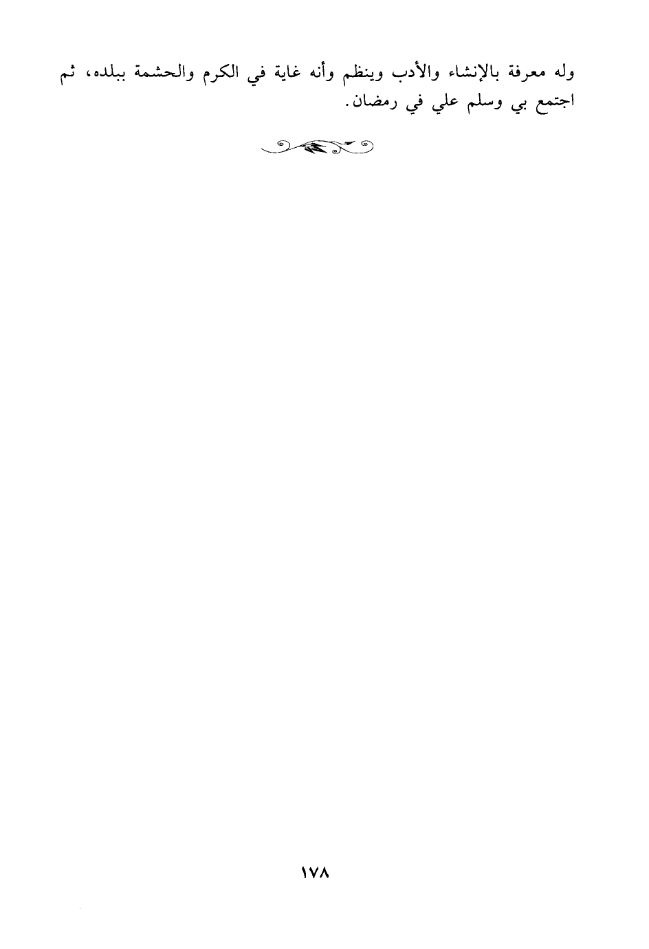 وله معرفة بالإنشاء والأدب وينظم وأنه غاية في الكرم والحشمة ببلده، ثم اجتمع بي وسلم علي في رمضان.