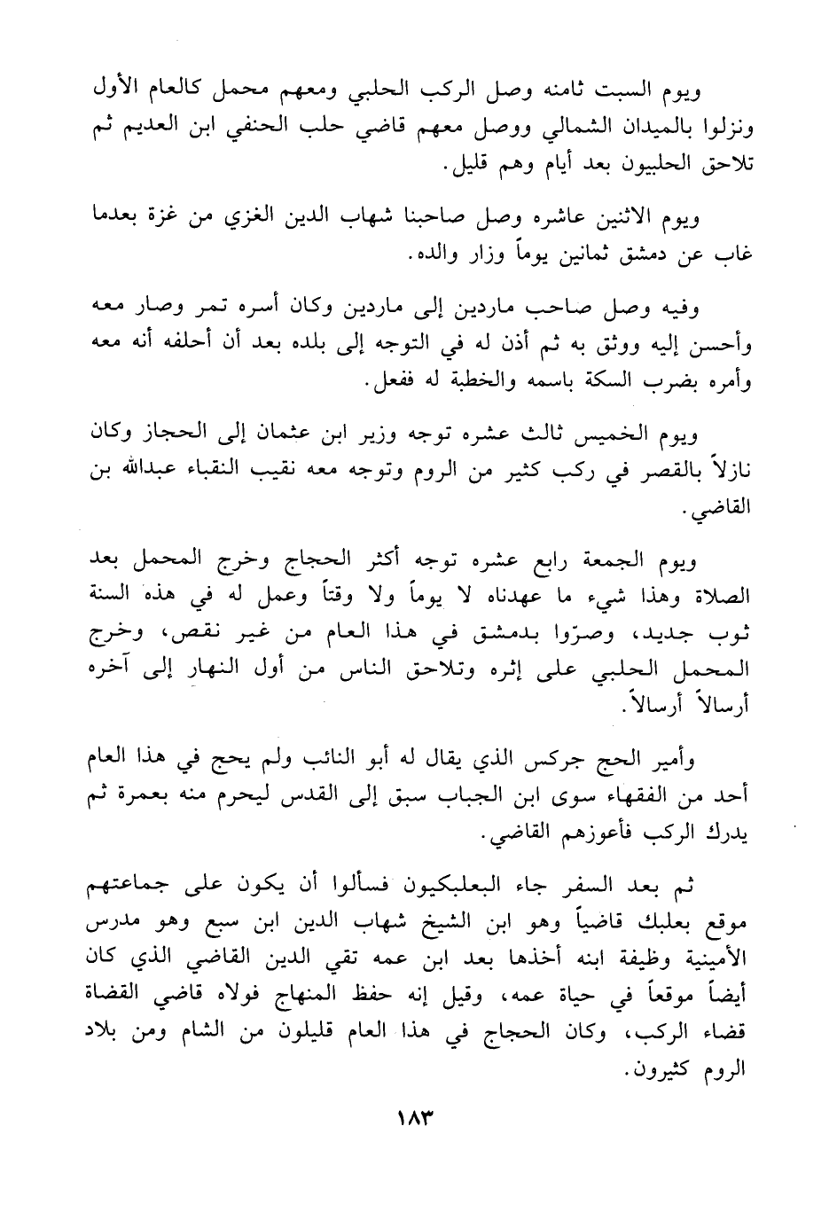 ويوم السبت ثامنه وصل الركب الحلبي ومعهم محمل كالعام الأول ونزلوا بالميدان الشمالي ووصل معهم قاضي حلب الحنفي ابن العديم ثم تلاحق الحلبيون بعد أيام وهم قليل.