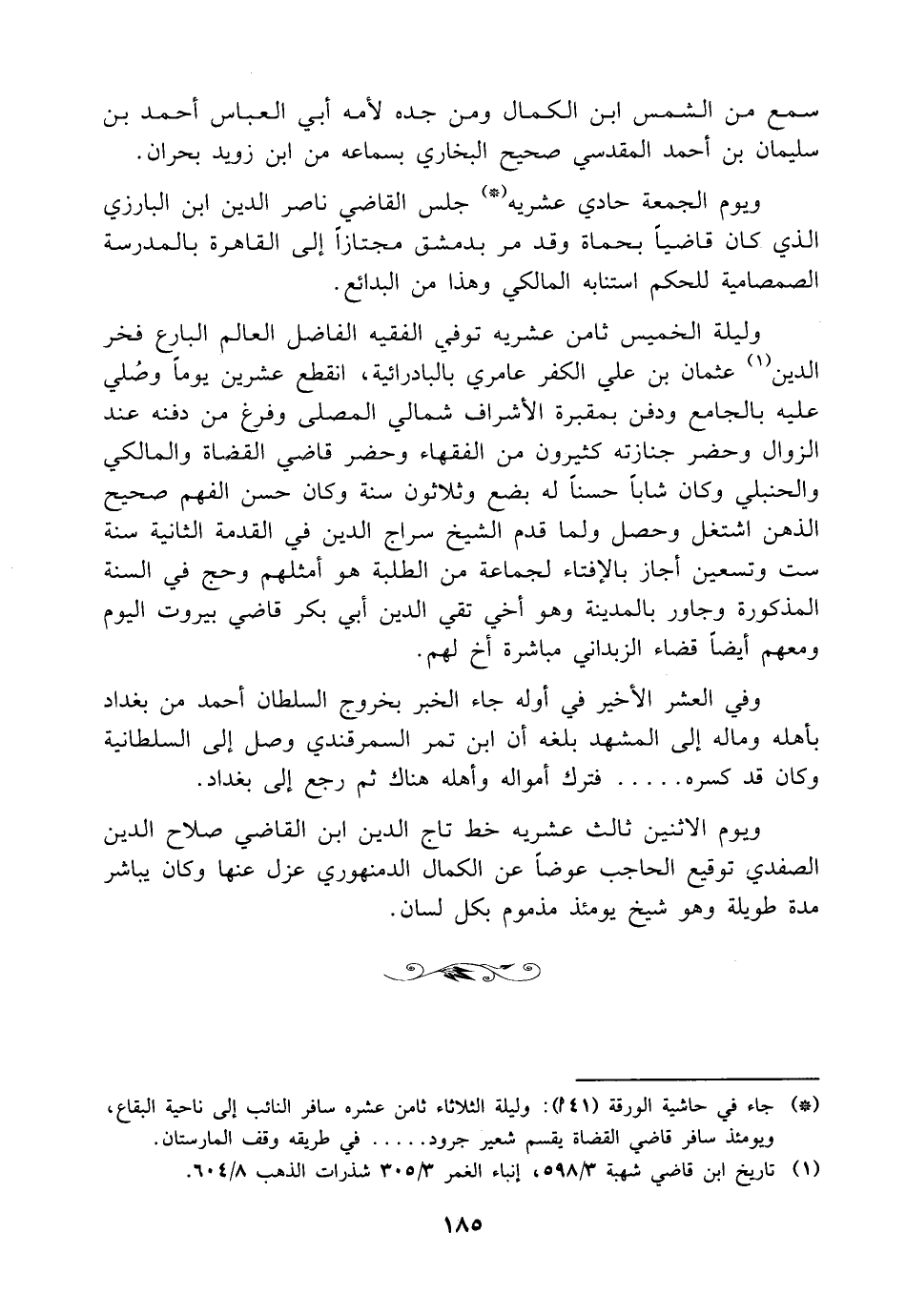 (*) جاء في حاشية الورقة (41 أ): وليلة الثلاثاء ثامن عشره سافر النائب إلى ناحية البقاع، ويومئذ سافر قاضي القضاة يقسم شعير جرود ..... في طريقه وقف المارستان.