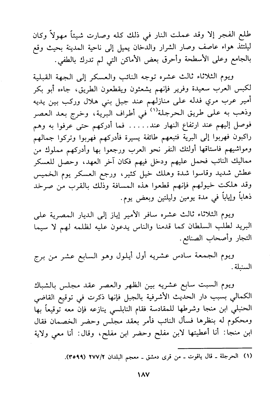 ويوم الثلاثاء ثالث عشره توجه النائب والعسكر إلى الجهة القبلية لكبس العرب سعيدة وفرير فإنهم يشعثون ويقطعون الطريق، جاءه أبو بكر أمير عرب مري فدله على منازلهم عند جبل بني هلال وركب بين يديه وذهب به على طريق الحرجلة (¬1) في أطراف البرية، وخرج بعد العصر فوصل إليهم عند ارتفاع النهار عند ..... فما أدركهم حتى عرفوا به وهم راكبون فهربوا إلى البرية فتبعهم طائفة يسيرة فأدركهم فهربوا وتركوا جمالهم ومواشيهم فاستاقها أولئك النفر نحو العرب ورجعوا بها وأدركهم مملوك من مماليك النائب فحمل عليهم ودخل فيهم فكان آخر العهد، وحصل للعسكر عطش شديد وقاسوا شدة وهلك خيل كثير، ورجع العسكر يوم الخميس وقد هلكت خيولهم فإنهم قطعوا هذه المسافة وذلك بالقرب من صرخد ذهاباً وإياباً في مدة يومين وليلتين وبعض يوم.
