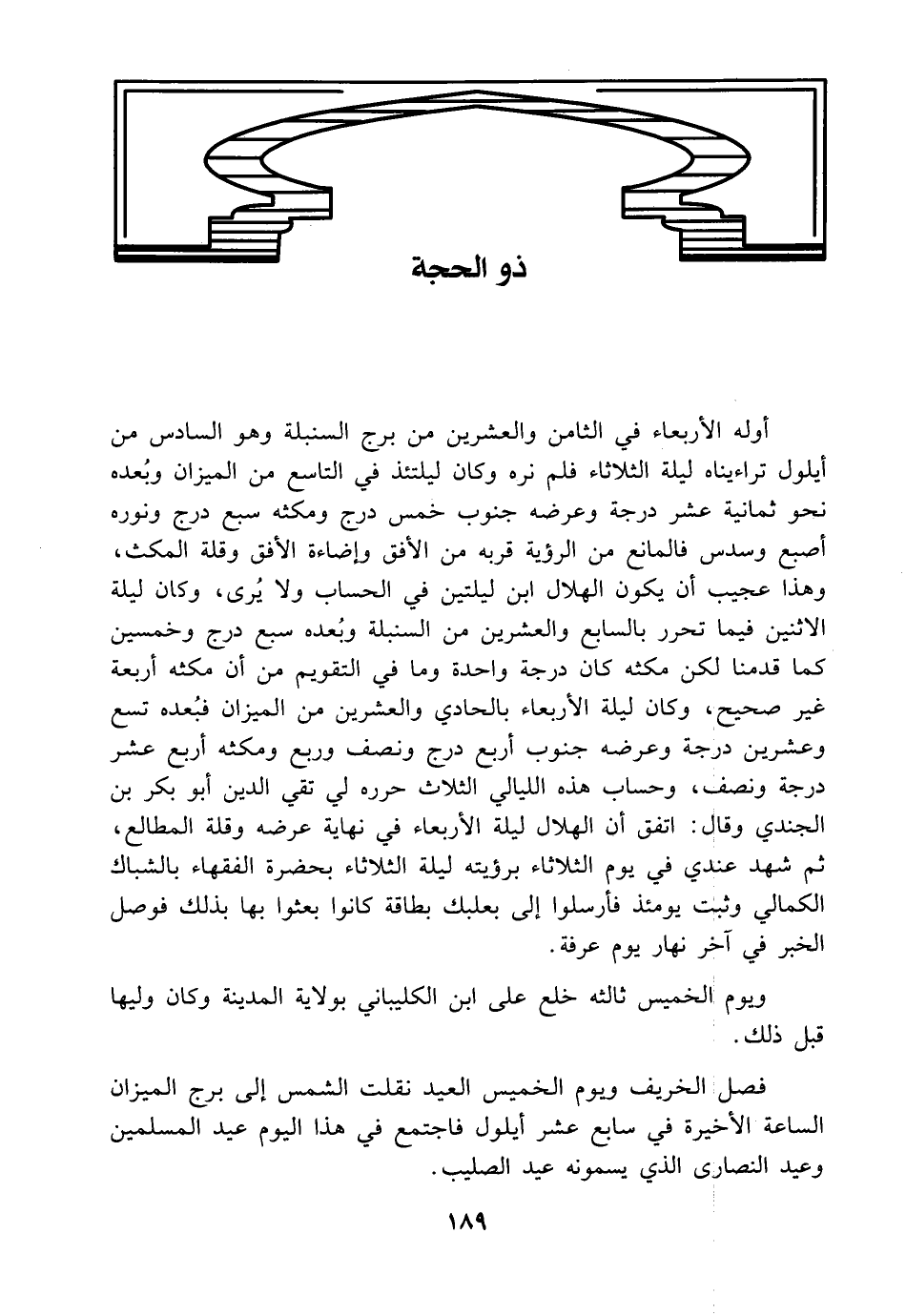 أوله الأربعاء في الثامن والعشرين من برج السنبلة وهو السادس من أيلول تراءيناه ليلة الثلاثاء فلم نره وكان ليلتئذ في التاسع من الميزان وبُعده نحو ثمانية عشر درجة وعرضه جنوب خمس درج ومكثه سبع درج ونوره أصبع وسدس فالمانع من الرؤية قربه من الأفق وإضاءة الأفق وقلة المكث، وهذا عجيب أن يكون الهلال ابن ليلتين في الحساب ولا يُرى، وكان ليلة الاثنين فيما تحرر بالسابع والعشرين من السنبلة وبُعده سبع درج وخمسين كما قدمنا لكن مكثه كان درجة واحدة وما في التقويم من أن مكثه أربعة غير صحيح، وكان ليلة الأربعاء بالحادي والعشرين من الميزان فبُعده تسع وعشرين درجة وعرضه جنوب أربع درج ونصف وربع ومكثه أربع عشر درجة ونصف، وحساب هذه الليالي الثلاث حرره لي تقي الدين أبو بكر بن الجندي وقال: اتفق أن الهلال ليلة الأربعاء في نهاية عرضه وقلة المطالع، ثم شهد عندي في يوم الثلاثاء برؤيته ليلة الثلاثاء بحضرة الفقهاء بالشباك الكمالي وثبت يومئذ فأرسلوا إلى بعلبك بطاقة كانوا بعثوا بها بذلك فوصل الخبر في آخر نهار يوم عرفة.