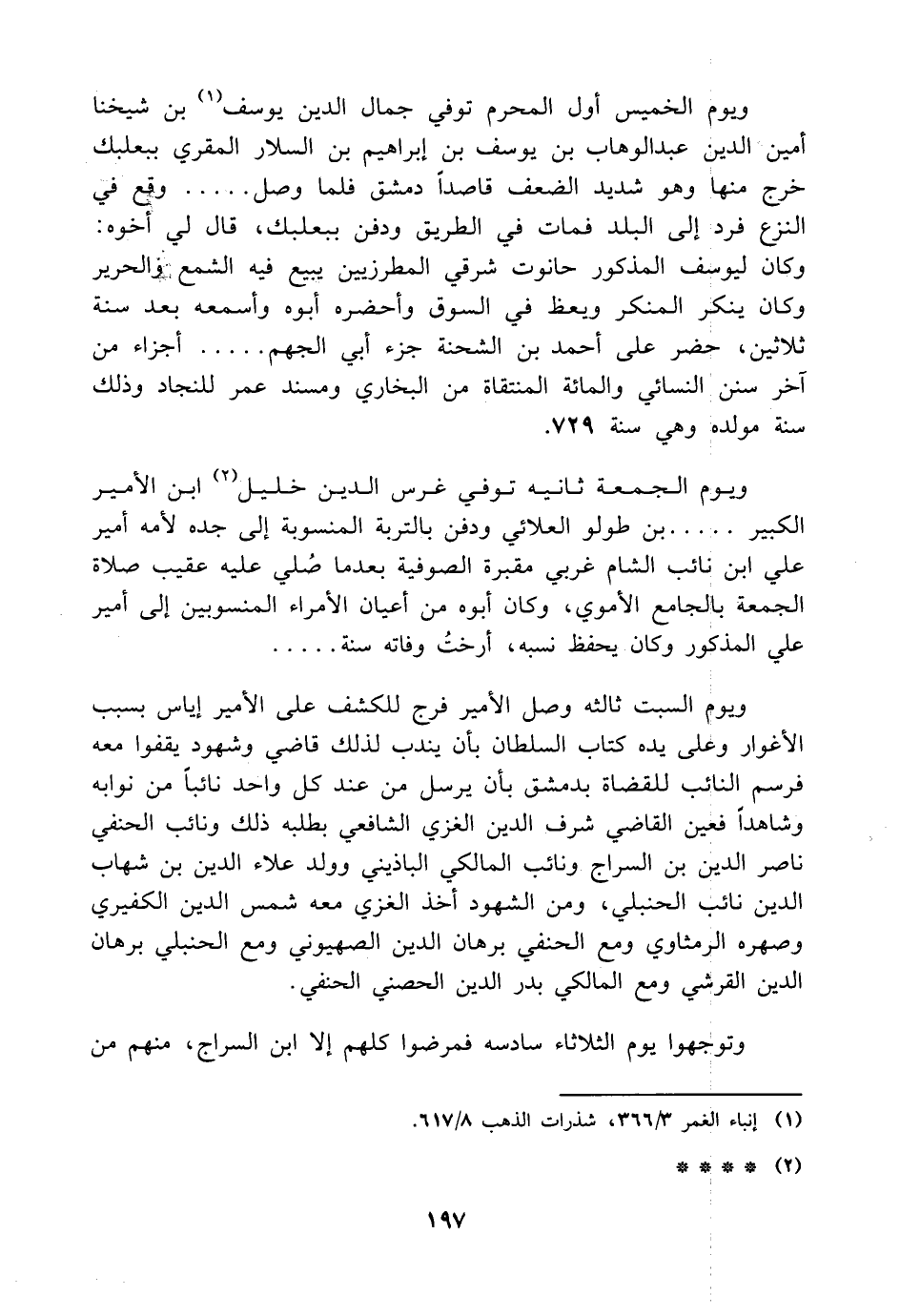 ويوم السبت ثالثه وصل الأمير فرج للكشف على الأمير إياس بسبب الأغوار وعلى يده كتاب السلطان بأن يندب لذلك قاضي وشهود يقفوا معه فرسم النائب للقضاة بدمشق بأن يرسل من عند كل واحد نائباً من نوابه وشاهداَ فعين القاضي شرف الدين الغزي الشافعي بطلبه ذلك ونائب الحنفي ناصر الدين بن السراج ونائب المالكي الباذيني وولد علاء الدين بن شهاب الدين نائب الحنبلي، ومن الشهود أخذ الغزي معه شمس الدين الكفيري وصهره الرمثاوي ومع الحنفي برهان الدين الصهيوني ومع الحنبلي برهان الدين القرشي ومع المالكي بدر الدين الحصني الحنفي.