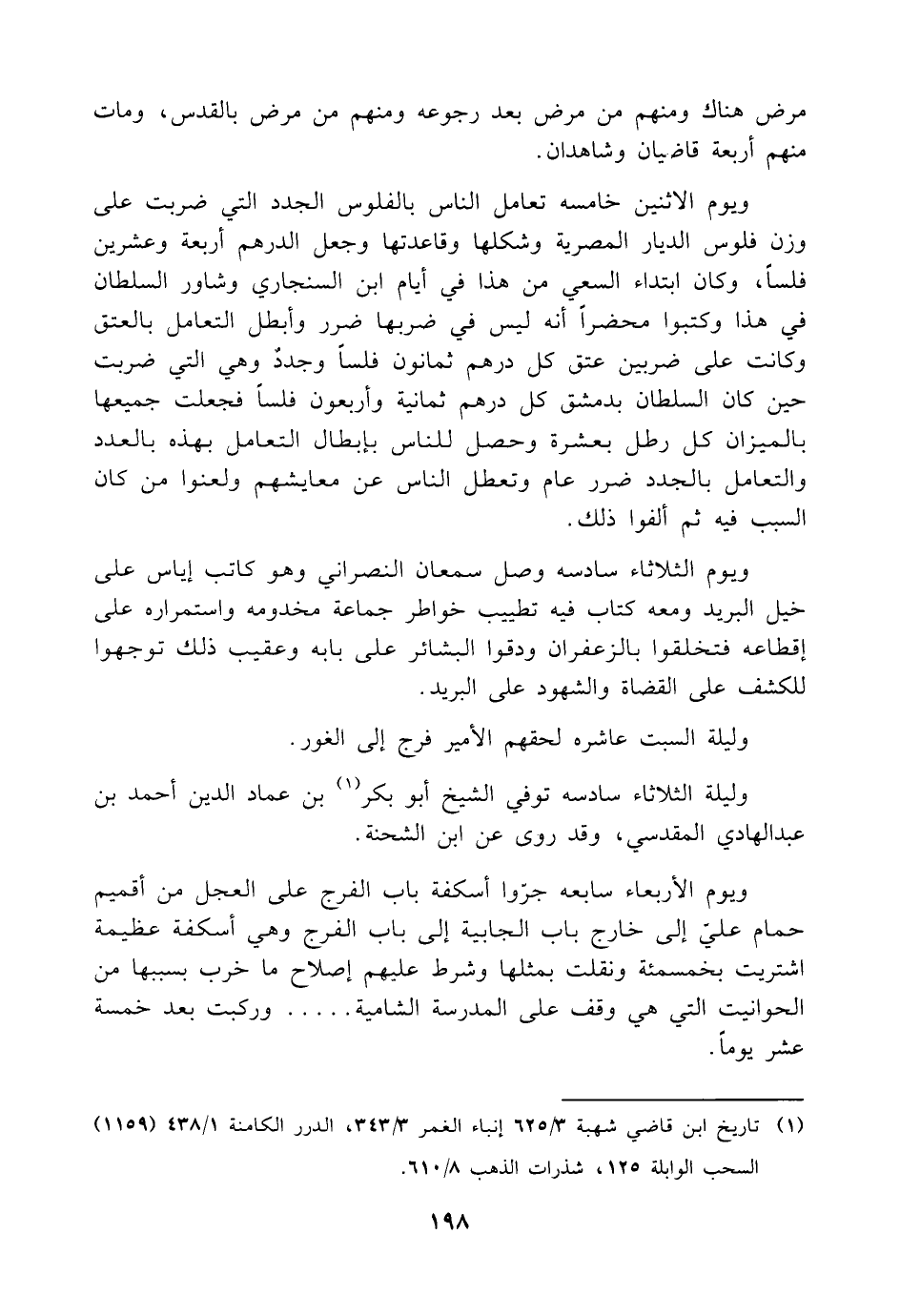 ويوم الاثنين خامسه تعامل الناس بالفلوس الجدد التي ضربت على وزن فلوس الديار المصرية وشكلها وقاعدتها وجعل الدرهم أربعة وعشرين فلساَ، وكان ابتداء السعي من هذا في أيام ابن السنجاري وشاور السلطان في هذا وكتبوا محضراً أنه ليس في ضربها ضرر وأبطل التعامل بالعتق وكانت على ضربين عتق كل درهم ثمانون فلساً وجددٌ وهي التي ضربت حين كان السلطان بدمشق كل درهم ثمانية وأربعون فلساً فجعلت جميعها بالميزان كل رطل بعشرة وحصل للناس بإبطال التعامل بهذه بالعدد والتعامل بالجدد ضرر عام وتعطل الناس عن معايشهم ولعنوا من كان السبب فيه ثم ألفوا ذلك.
