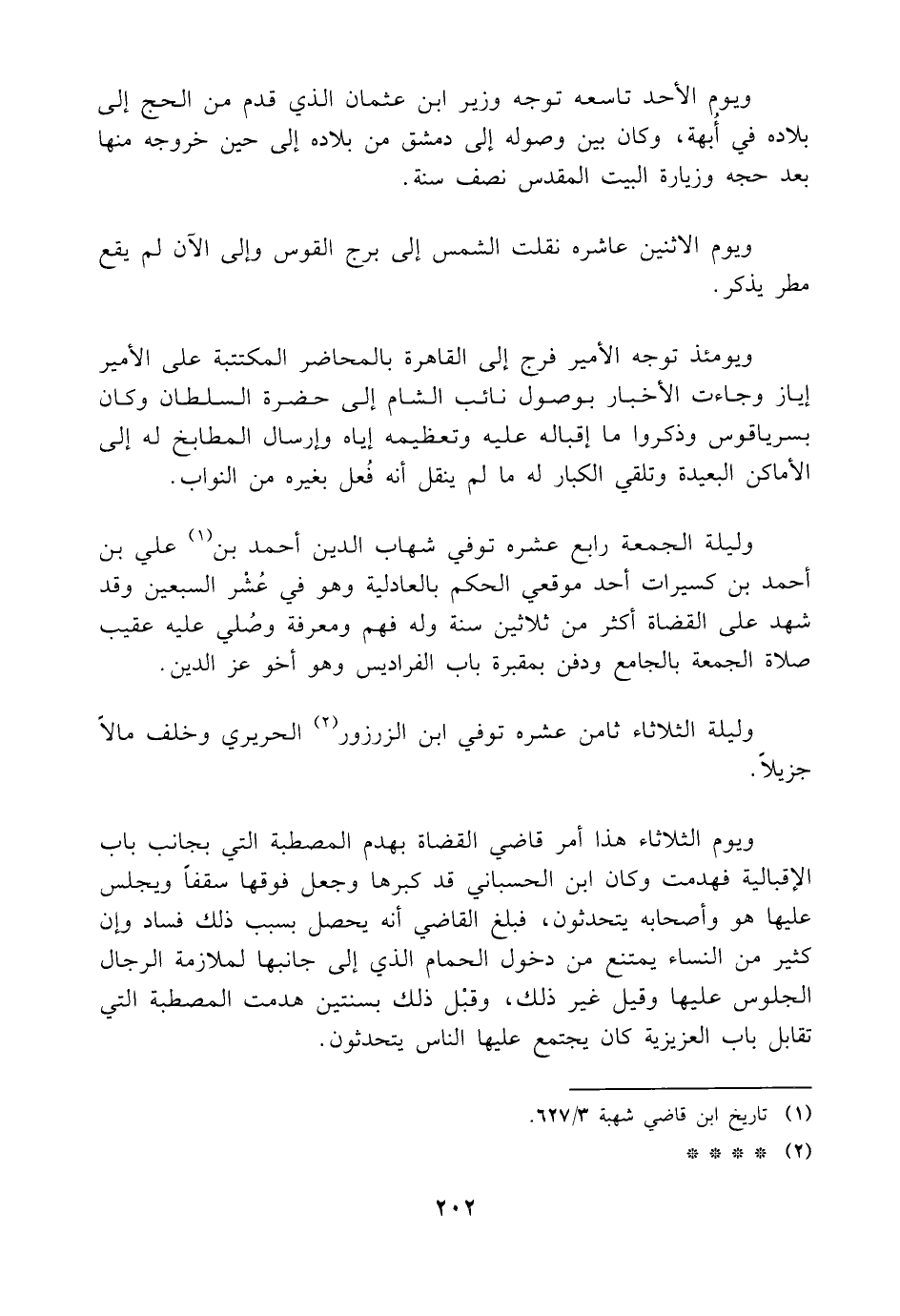 ويوم الأحد تاسعه توجه وزير ابن عثمان الذي قدم من الحج إلى بلاده في أُبهة، وكان بين وصوله إلى دمشق من بلاده إلى حين خروجه منها بعد حجه وزيارة البيت المقدس نصف سنة.