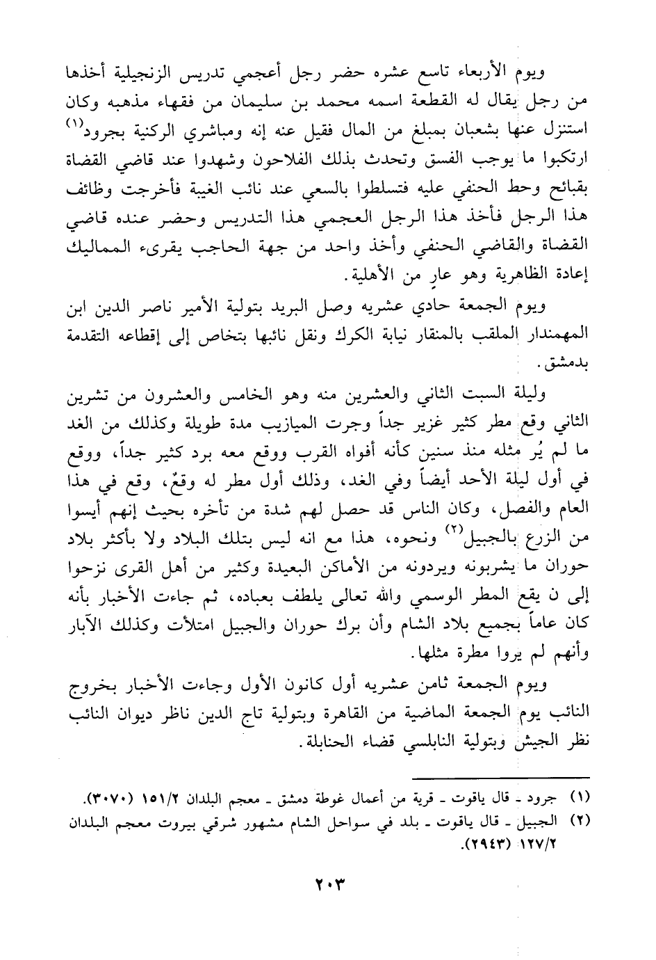 وليلة السبت الثاني والعشرين منه وهو الخامس والعشرون من تشرين الثاني وقع مطر كثير غزير جداً وجرت الميازيب مدة طويلة وكذلك من الغد ما لم يُر مثله منذ سنين كأنه أفواه القرب ووقع معه برد كثير جداً، ووقع في أول ليلة الأحد أيضاً وفي الغد، وذلك أول مطر له وقعٌ، وقع في هذا العام والفصل، وكان الناس قد حصل لهم شدة من تأخره بحيث إنهم أيسوا من الزرع بالجبيل (¬2) ونحوه، هذا مع أنه ليس بتلك البلاد ولا بأكثر بلاد حوران ما يشربونه ويردونه من الأماكن البعيدة وكثير من أهل القرى نزحوا إلى أن يقع المطر الوسمي والله تعالى يلطف بعباده، ثم جاءت الأخبار بأنه كان عاماً بجميع بلاد الشام وأن برك حوران والجبيل امتلأت وكذلك الآبار وأنهم لم يروا مطرة مثلها.