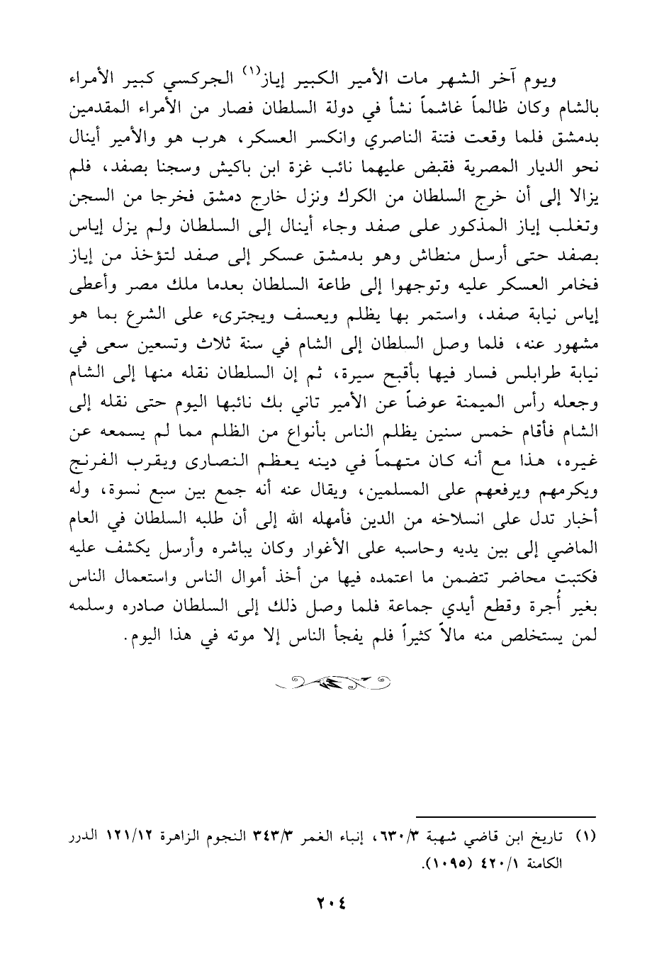 ويوم آخر الشهر مات الأمير الكبير إياز (¬1) الجركسي كبير الأمراء بالشام وكان ظالماً غاشماً نشأ في دولة السلطان فصار من الأمراء المقدمين بدمشق فلما وقعت فتنة الناصري وانكسر العسكر، هرب هو والأمير أينال نحو الديار المصرية فقبض عليهما نائب غزة ابن باكيش وسجنا بصفد، فلم يزالا إلى أن خرج السلطان من الكرك ونزل خارج دمشق فخرجا من السجن وتغلب إياز المذكور على صفد وجاء أينال إلى السلطان ولم يزل إياس بصفد حتى أرسل منطاش وهو بدمشق عسكر إلى صفد لتؤخذ من إياز فخامر العسكر عليه وتوجهوا إلى طاعة السلطان بعدما ملك مصر وأعطى إياس نيابة صفد، واستمر بها يظلم ويعسف ويجترئ على الشرع بما هو مشهور عنه، فلما وصل السلطان إلى الشام في سنة ثلاث وتسعين سعى في نيابة طرابلس فسار فيها بأقبح سيرة، ثم إن السلطان نقله منها إلى الشام وجعله رأس الميمنة عوضاً عن الأمير تاني بك نائبها اليوم حتى نقله إلى الشام فأقام خمس سنين يظلم الناس بأنواع من الظلم مما لم يسمعه عن غيره، هذا مع أنه كان متهماً في دينه يعظم النصارى ويقرب الفرنج ويكرمهم ويرفعهم على المسلمين، ويقال عنه أنه جمع بين سبع نسوة، وله أخبار تدل على انسلاخه من الدين فأمهله الله إلى أن طلبه السلطان في العام الماضي إلى بين يديه وحاسبه على الأغوار وكان يباشره وأرسل يكشف عليه فكتبت محاضر تتضمن ما اعتمده فيها من أخذ أموال الناس واستعمال الناس بغير أُجرة وقطع أيدي جماعة فلما وصل ذلك إلى السلطان صادره وسلمه لمن يستخلص منه مالاً كثيراً فلم يفجأ الناس إلا موته في هذا اليوم.