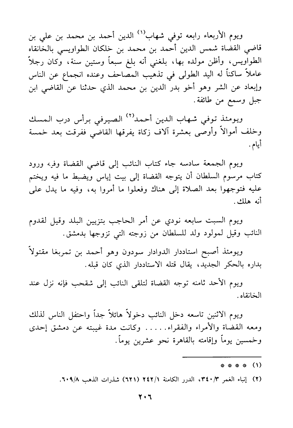 ويوم الأربعاء رابعه توفي شهاب (¬1) الدين أحمد بن محمد بن علي بن قاضي القضاة شمس الدين أحمد بن محمد بن خلكان الطواويسي بالخانقاه الطواويس، وأظن مولده بها، بلغني أنه بلغ سبعاً وستين سنة، وكان رجلاً عاملاً ساكناً له اليد الطولى في تذهيب المصاحف وعنده انجماع عن الناس وإبعاد عن الشر وهو أخو بدر الدين بن محمد الذي حدثنا عن القاضي ابن جبل وسمع من طائفة.