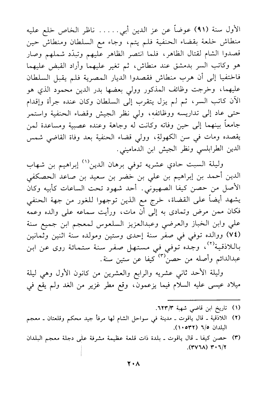 الأول سنة (91) عوضاً عن عز الدين أبي ..... ناظر الخاص خلع عليه منطاش خلعة بقضاء الحنفية فلم يتم، وجاء مع السلطان ومنطاش حين قصدوا الشام لقتال الظاهر، فلما انتصر الظاهر عليهم وتبدّد شملهم وصار هو وكاتب السر بدمشق عند منطاش، ثم تغير عليهما وأراد القبض عليهما فاختفيا إلى أن هرب منطاش فقصدوا الديار المصرية فلم يقبل السلطان عليهما، وخرجت وظائف المذكور وولي بعضها بدر الدين محمود الذي هو الآن كاتب السر، ثم لم يزل يتقرب إلى السلطان وكان عنده جرأة وإقدام حتى عاد إلى تداريسه ووظائفه، ولي نظر الجيش وقضاء الحنفية واستمر جامعا بينهما إلى حين وفاته وكانت له وجاهة وعنده عصبية ومساعدة لمن يقصده ومات في سن الكهولةِ، وولي قضاء الحنفية بعد وفاة القاضي شمس الدين الطرابلسي ونظر الجيش ابن الدماميني.