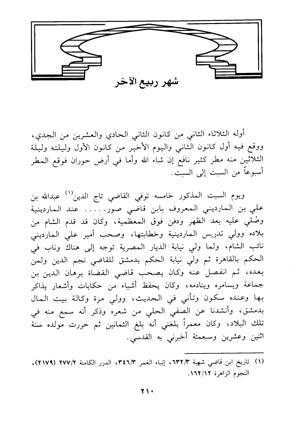 ويوم السبت المذكور خامسه توفي القاضي تاج الدين (¬1) عبد الله بن علي بن المارديني المعروف بابن قاضي صور ..... عند الماردينية وصُلي عليه بعد الظهر ودفن فوق المعظمية، وكان قد قدم الشام من بلاده وولي تدريس الماردينية وخطابتها، وصحب أمير علي المارديني نائب الشام، ولما ولي نيابة الديار المصرية توجه إلى هناك وناب في الحكم بالقاهرة ثم ولي نيابة الحكم بدمشق للقاضي نجم الدين ولمن بعده، ثم انفصل عنه وكان يصحب قاضي القضاة برهان الدين بن جماعة ويسامره وينادمه، وكان يحفظ أشياء من حكايات وأشعار يذاكر بها وعنده سكون وتأني في الحديث، وولي مرة وكالة بيت المال بدمشق، وأنشدنا عن الصفي الحلي من شعره وذكر أنه سمع منه في تلك البلاد، وكان معمراً بلغني أنه بلغ الثمانين ثم حررت مولده سنة ائنين وعشرين وسبعمئة أخبرني به القدسي.
