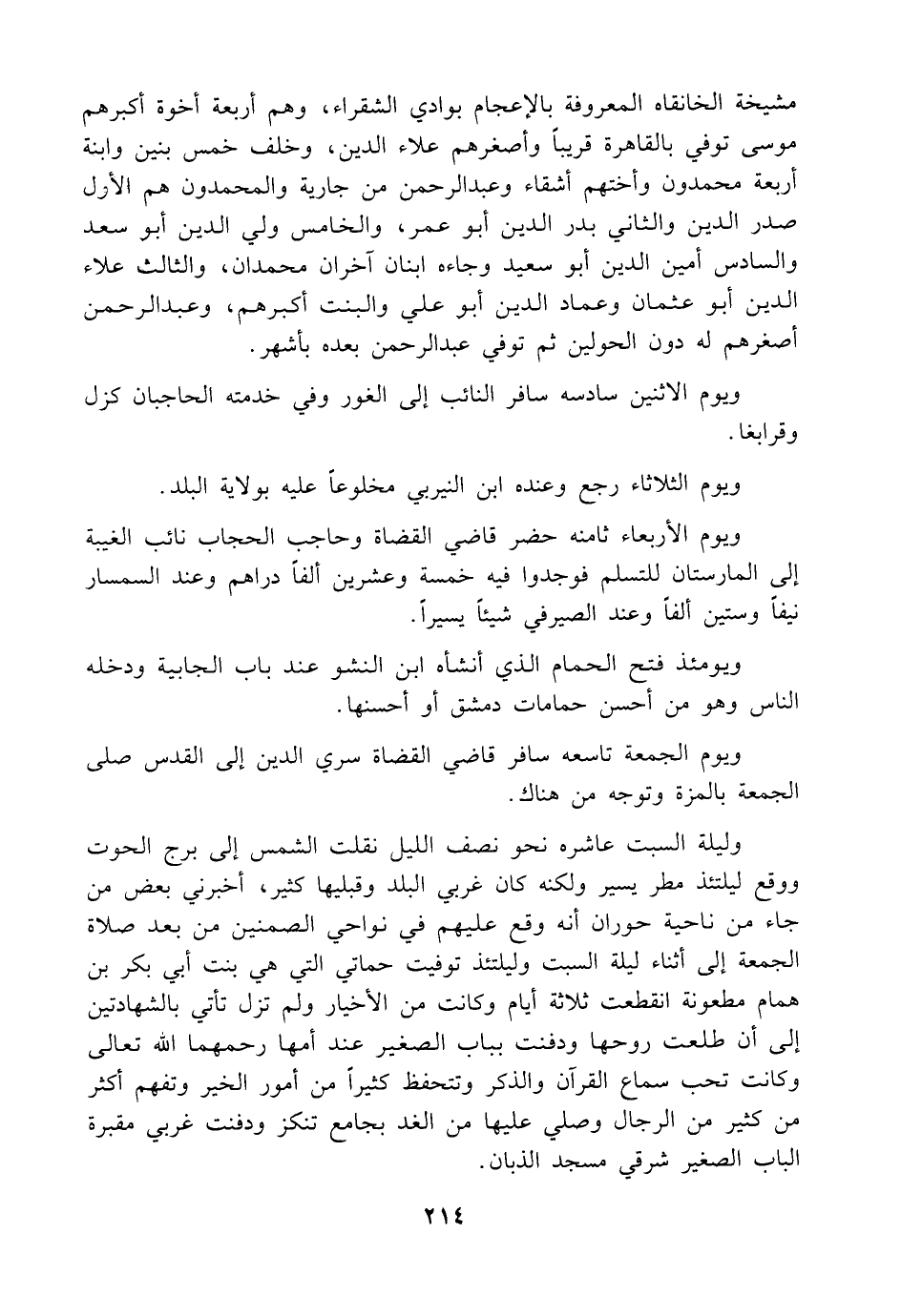 وليلة السبت عاشره نحو نصف الليل نقلت الشمس إلى برج الحوت ووقع ليلتئذ مطر يسير ولكنه كان غربي البلد وقبليها كثير، أخبرني بعض من جاء من ناحية حوران أنه وقع عليهم في نواحي الصمنين من بعد صلاة الجمعة إلى أثناء ليلة السبت وليلتئذ توفيت حماتي التي هي بنت أبي بكر بن همام مطعونة انقطعت ثلاثة أيام وكانت من الأخيار ولم تزل تأتي بالشهادتين إلى أن طلعت روحها ودفنت بباب الصغير عند أمها رحمهما الله تعالى وكانت تحب سماع القرآن والذكر وتتحفظ كثيراً من أمور الخير وتفهم أكثر من كثير من الرجال وصلي عليها من الغد بجامع تنكز ودفنت غربي مقبرة الباب الصغير شرقي مسجد الذبان.