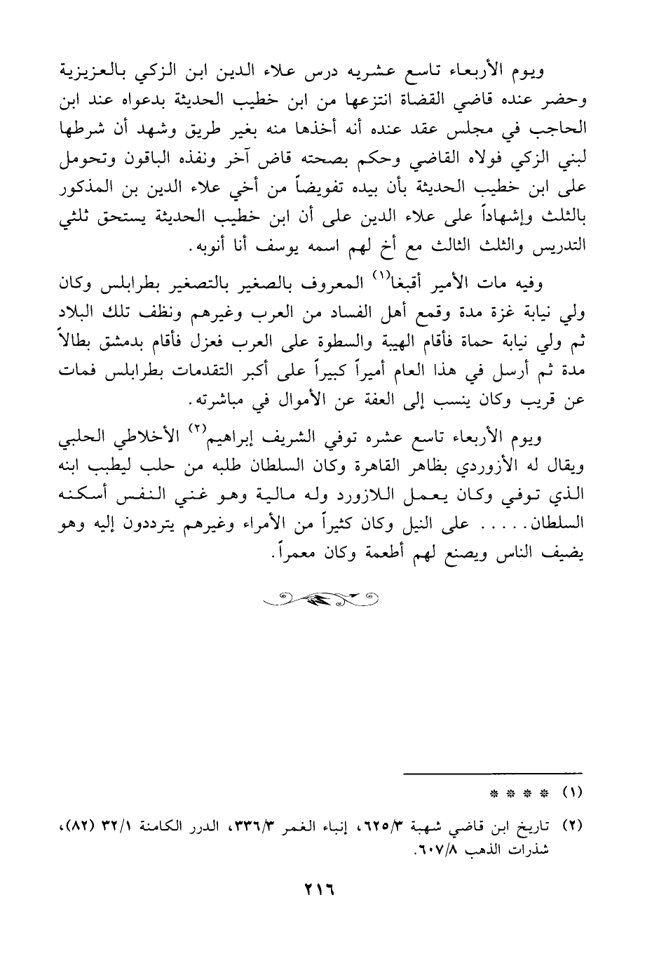 ويوم الأربعاء تاسع عشريه درس علاء الدين ابن الزكي بالعزيزية وحضر عنده قاضي القضاة انتزعها من ابن خطيب الحديثة بدعواه عند ابن الحاجب في مجلس عقد عنده أنه أخذها منه بغير طريق وشهد أن شرطها لبني الزكي فولاه القاضي وحكم بصحته قاض آخر ونفذه الباقون وتحومل على ابن خطيب الحديثة بأن بيده تفويضاً من أخي علاء الدين بن المذكور بالثلث وإشهاداً على علاء الدين على أن ابن خطيب الحديثة يستحق ثلثي التدريس والثلث الثالث مع أخ لهم اسمه يوسف أنا أنوبه.