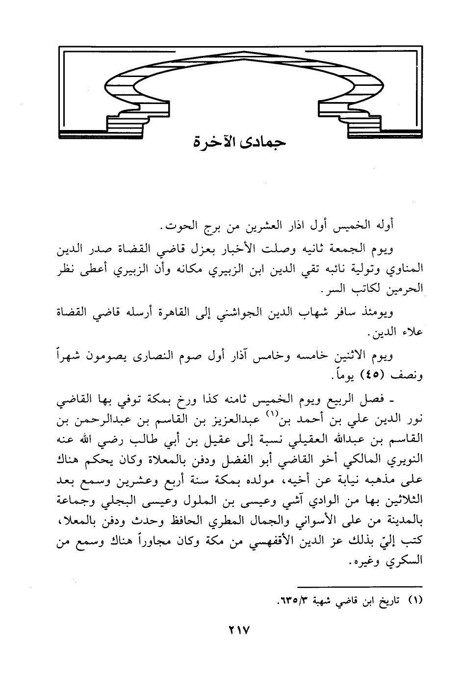 - فصل الربيع ويوم الخميس ثامنه كذا ورخ بمكة توفي بها القاضي نور الدين علي بن أحمد بن (¬1) عبد العزيز بن القاسم بن عبد الرحمن بن القاسم بن عبد الله العقيلي نسبة إلى عقيل بن أبي طالب رضي الله عنه النويري المالكي أخو القاضي أبو الفضل ودفن بالمعلاة وكان يحكم هناك على مذهبه نيابة عن أخيه، مولده بمكة سنة أربع وعشرين وسمع بعد الثلاثين بها من الوادي آشي وعيسى بن الملول وعيسى البجلي وجماعة بالمدينة من على الأسواني والجمال المطري الحافظ وحدث ودفن بالمعلا، كتب إليّ بذلك عز الدين الأقفهسي من مكة وكان مجاوراً هناك وسمع من السكري وغيره.