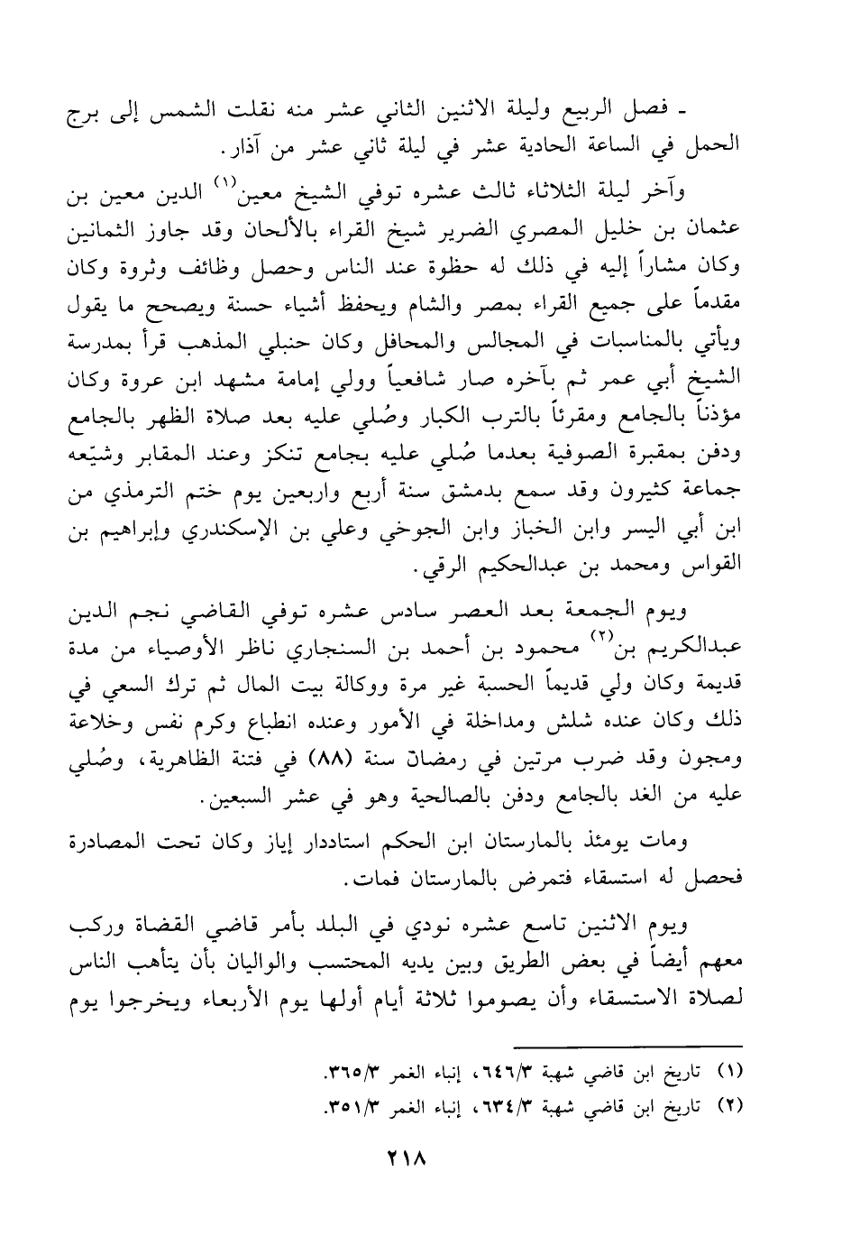 (¬2) تاريخ ابن قاضي شهبة 3/ 634، إنباء الغمر 3/ 351.