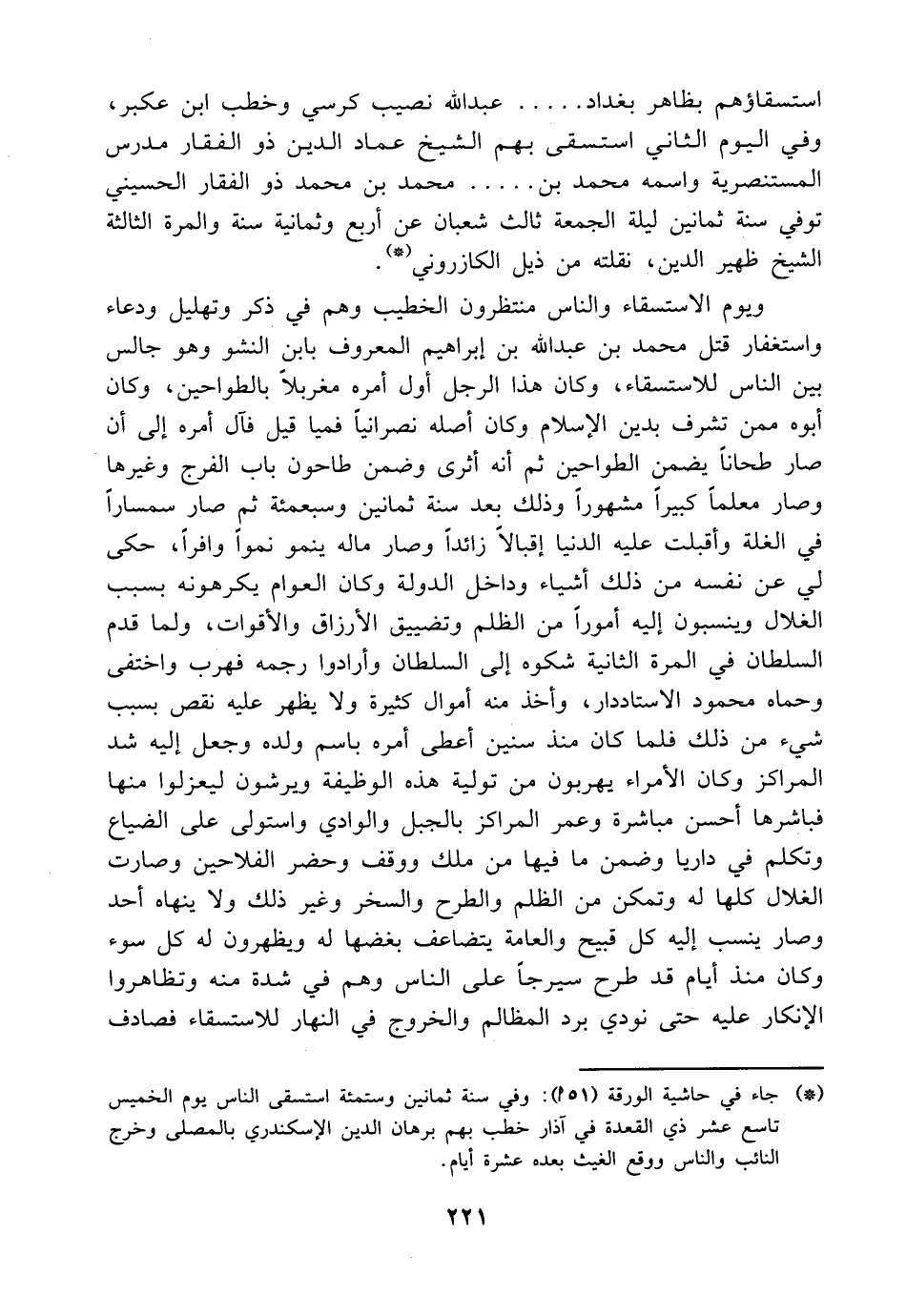 استسقاؤهم بظاهر بغداد ..... عبد الله نصيب كرسي وخطب ابن عكبر، وفي اليوم الثاني استسقى بهم الشيخ عماد الدين ذو الفقار مدرس المستنصرية واسمه محمد بن ..... محمد بن محمد ذو الفقار الحسيني توفي سنة ثمانين ليلة الجمعة ثالث شعبان عن أربع وثمانية سنة والمرة الثالثة الشيخ ظهير الدين، نقلته من ذيل الكازروني (*).