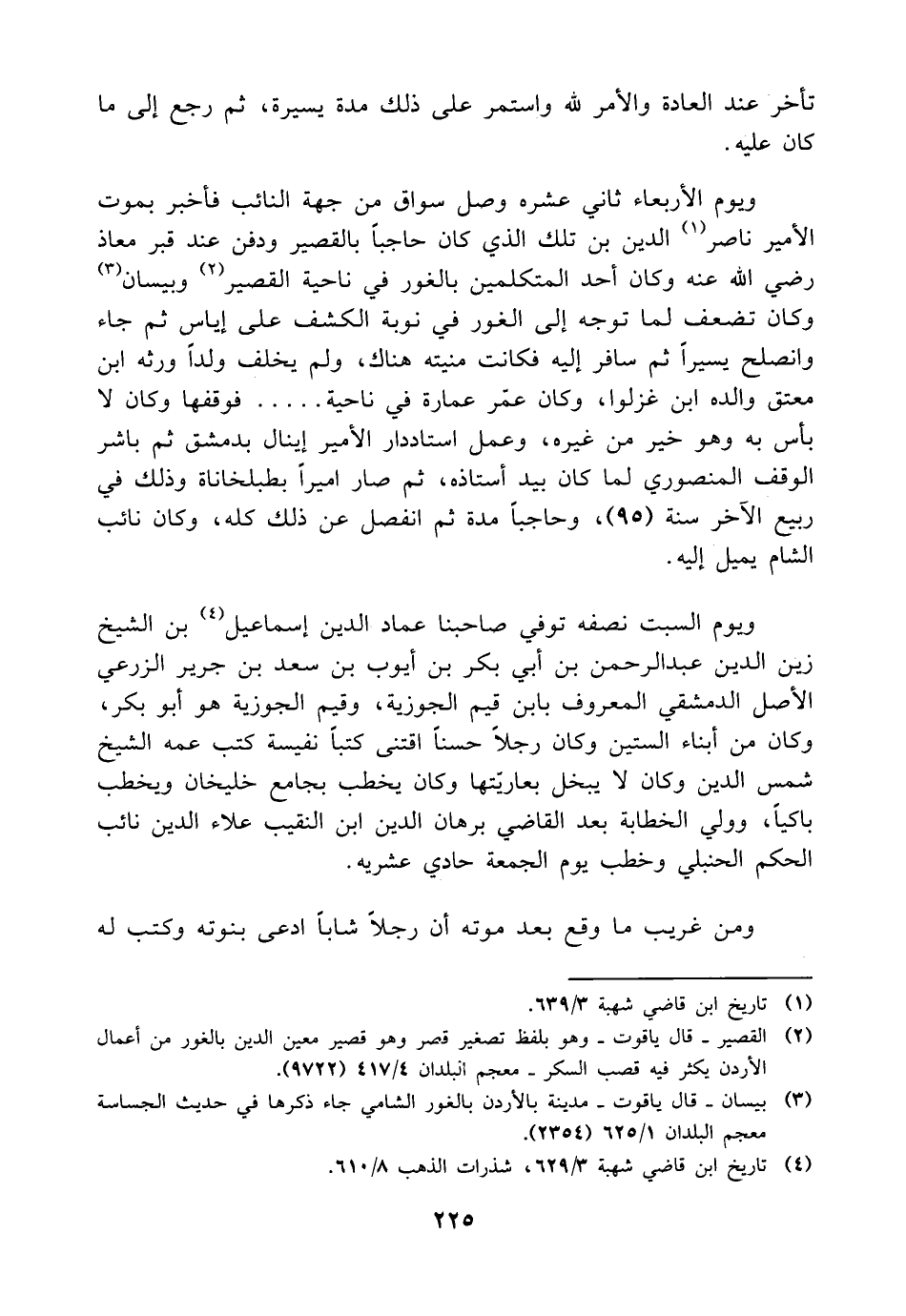 ويوم الأربعاء ثاني عشره وصل سواق من جهة النائب فأخبر بموت الأمير ناصر (¬1) الدين بن تلك الذي كان حاجبا بالقصير ودفن عند قبر معاذ رضي الله عنه وكان أحد المتكلمين بالغور في ناحية القصير (¬2) وبيسان (¬3) وكان تضعف لما توجه إلى الغور في نوبة الكشف على إياس ثم جاء وانصلح يسيراً ثم سافر إليه فكانت منيته هناك، ولم يخلف ولداً ورثه ابن معتق والده ابن غزلوا، وكان عضر عمارة في ناحية ..... فوقفها وكان لا بأس به وهو خير من غيره، وعمل استاددار الأمير إينال بدمشق ثم باشر الوقف المنصوري لما كان بيد أستاذه، ثم صار أميراً بطبلخاناة وذلك في ربيع الآخر سنة (95)، وحاجباً مدة ثم انفصل عن ذلك كله، وكان نائب الشام يميل إليه.