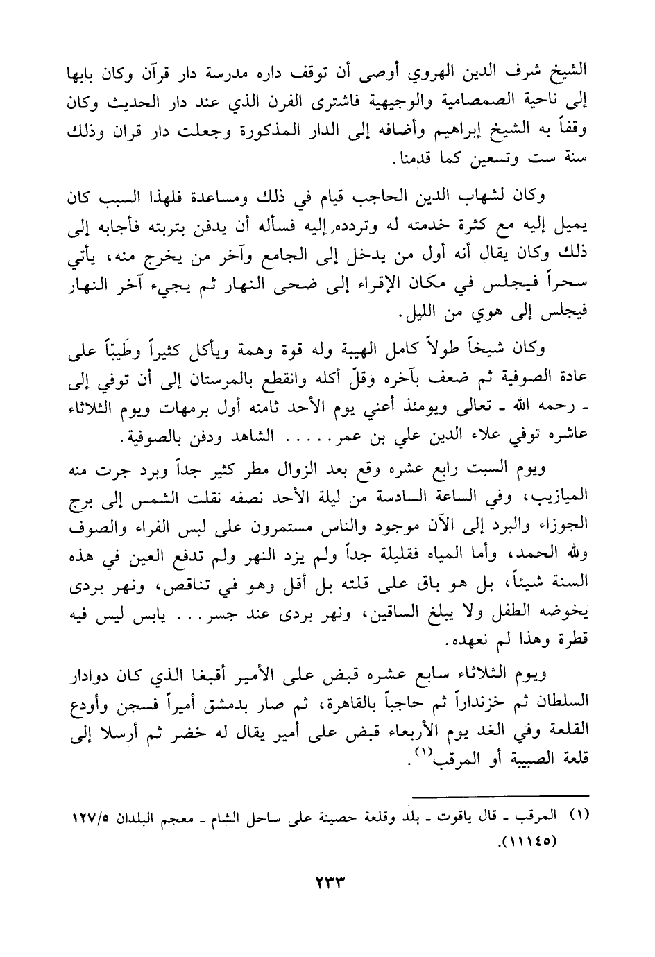 الشيخ شرف الدين الهروي أوصى أن توقف داره مدرسة دار قرآن وكان بابها إلى ناحية الصمصامية والوجيهية فاشترى الفرن الذي عند دار الحديث وكان وقفاً به الشيخ إبراهيم وأضافه إلى الدار المذكورة وجعلت دار قران وذلك سنة ست وتسعين كما قدمنا.