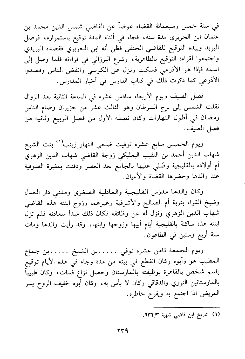 ويوم الجمعة ثامن عشره توفي ..... بن الشيخ ..... بن جماع المطبب هو وأبوه وكان انقطع في بيته من مدة وجاء في هذه الأيام توقيع باسم شخص بالقاهرة بوظيفته بالمارستان وحصل نزاع فمات، وكان طبيباً بالمارستانين النوري والدقاقي وكان لا بأس به، وكان أبوه خفيف الروح يسر المريض اذا اجتمع به ويفرح خاطره.