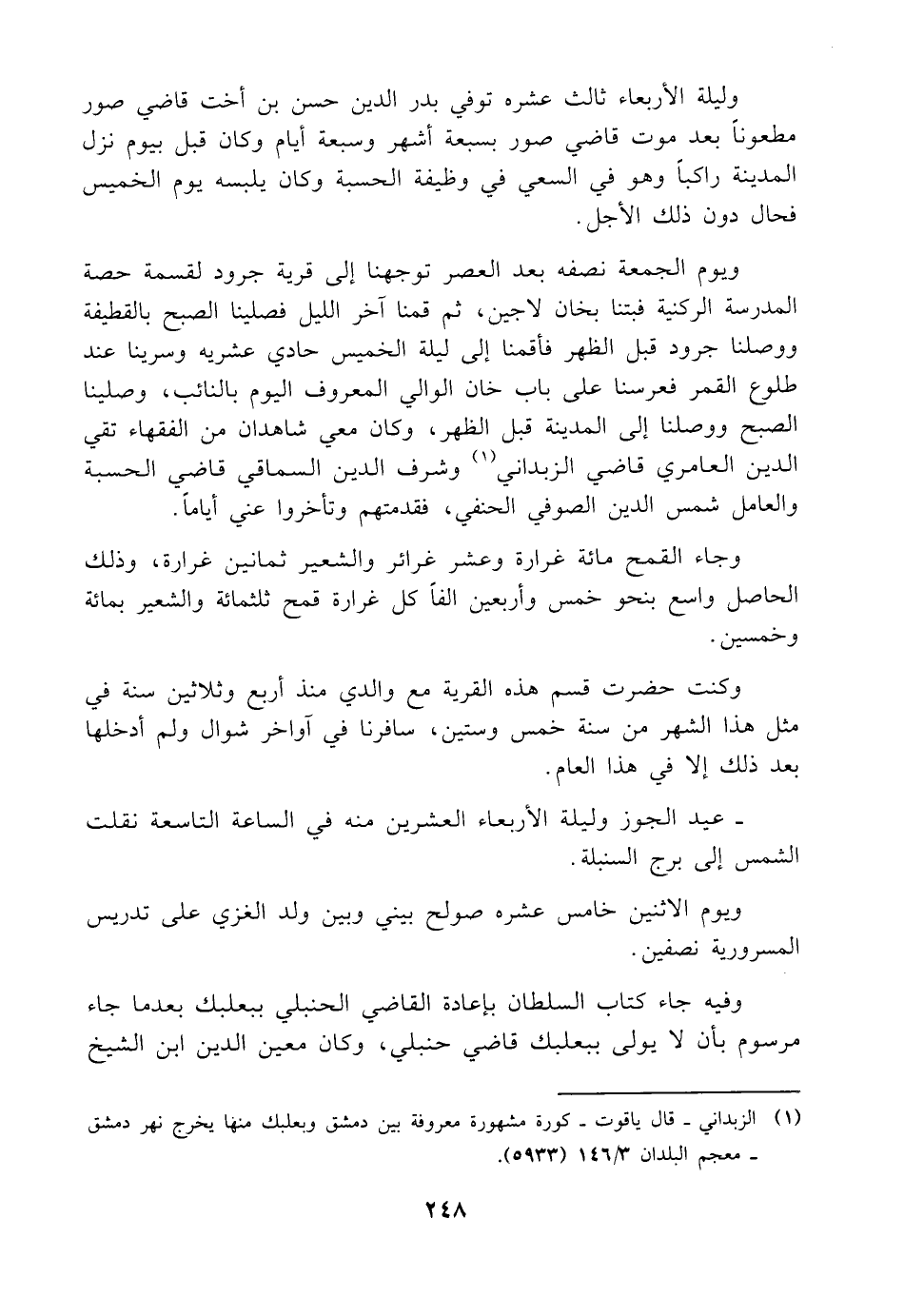 ويوم الجمعة نصفه بعد العصر توجهنا إلى قرية جرود لقسمة حصة المدرسة الركنية فبتنا بخان لاجين، ثم قمنا آخر الليل فصلينا الصبح بالقطيفة ووصلنا جرود قبل الظهر فأقمنا إلى ليلة الخميس حادي عشريه وسرينا عند طلوع القمر فعرسنا على باب خان الوالي المعروف اليوم بالنائب، وصلينا الصبح ووصلنا إلى المدينة قبل الظهر، وكان معي شاهدان من الفقهاء تقي الدين العامري قاضي الزبداني (¬1) وشرف الدين السماقي قاضي الحسبة والعامل شمس الدين الصوفي الحنفي، فقدمتهم وتأخروا عني أياماً.