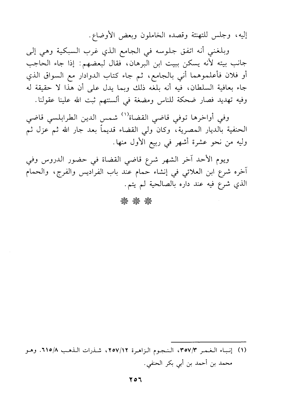 ويوم الأحد آخر الشهر شرع قاضي القضاة في حضور الدروس وفي آخره شرع ابن العلائي في إنشاء حمام عند باب الفراديس والفرج، والحمام الذي شرع فيه عند داره بالصالحية لم يتم.