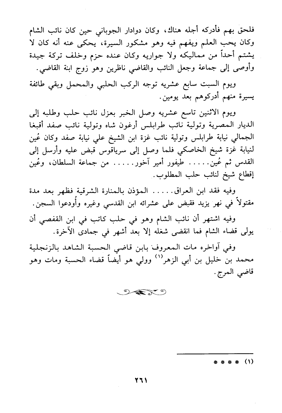 فلحق بهم فأدركه أجله هناك، وكان دوادار الجوباني حين كان نائب الشام وكان يحب العلم ويفهم فيه وهو مشكور السيرة، يحكى عنه أنه كان لا يشتم أحدًا من مماليكه ولا جواريه وكان عنده حزم وخلف تركة جيدة وأوصى إلى جماعة وجعل النائب والقاضي ناظرين وهو زوج ابنة القاضي.