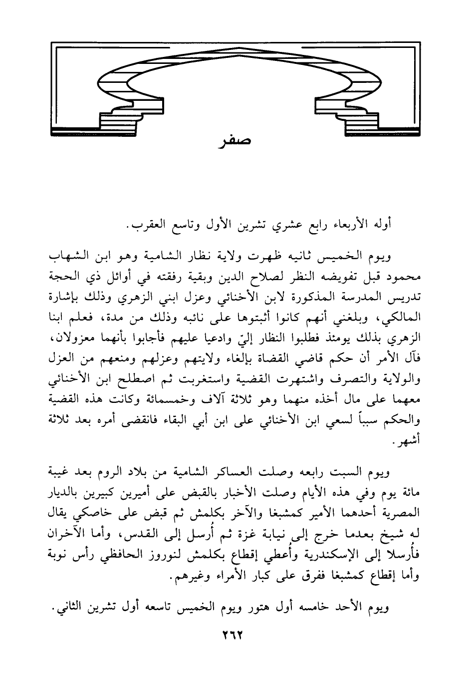 ويوم الخميس ثانيه ظهرت ولاية نظار الشامية وهو ابن الشهاب محمود قبل تفويضه النظر لصلاح الدين وبقية رفقته في أوائل ذي الحجة تدريس المدرسة المذكورة لابن الأخنائي وعزل ابني الزهري وذلك بإشارة المالكي، وبلغني أنهم كانوا أثبتوها على نائبه وذلك من مدة، فعلم ابنا الزهري بذلك يومئذ فطلبوا النظار إليّ وادعيا عليهم فأجابوا بأنهما معزولان، فآل الأمر أن حكم قاضي القضاة بإلغاء ولايتهم وعزلهم ومنعهم من العزل والولاية والتصرف واشتهرت القضية واستغربت ثم اصطلح ابن الأخنائي معهما على مال أخذه منهما وهو ثلاثة آلاف وخمسمائة وكانت هذه القضية والحكم سببًا لسعي ابن الأخنائي على ابن أبي البقاء فانقضى أمره بعد ثلاثة أشهر.
