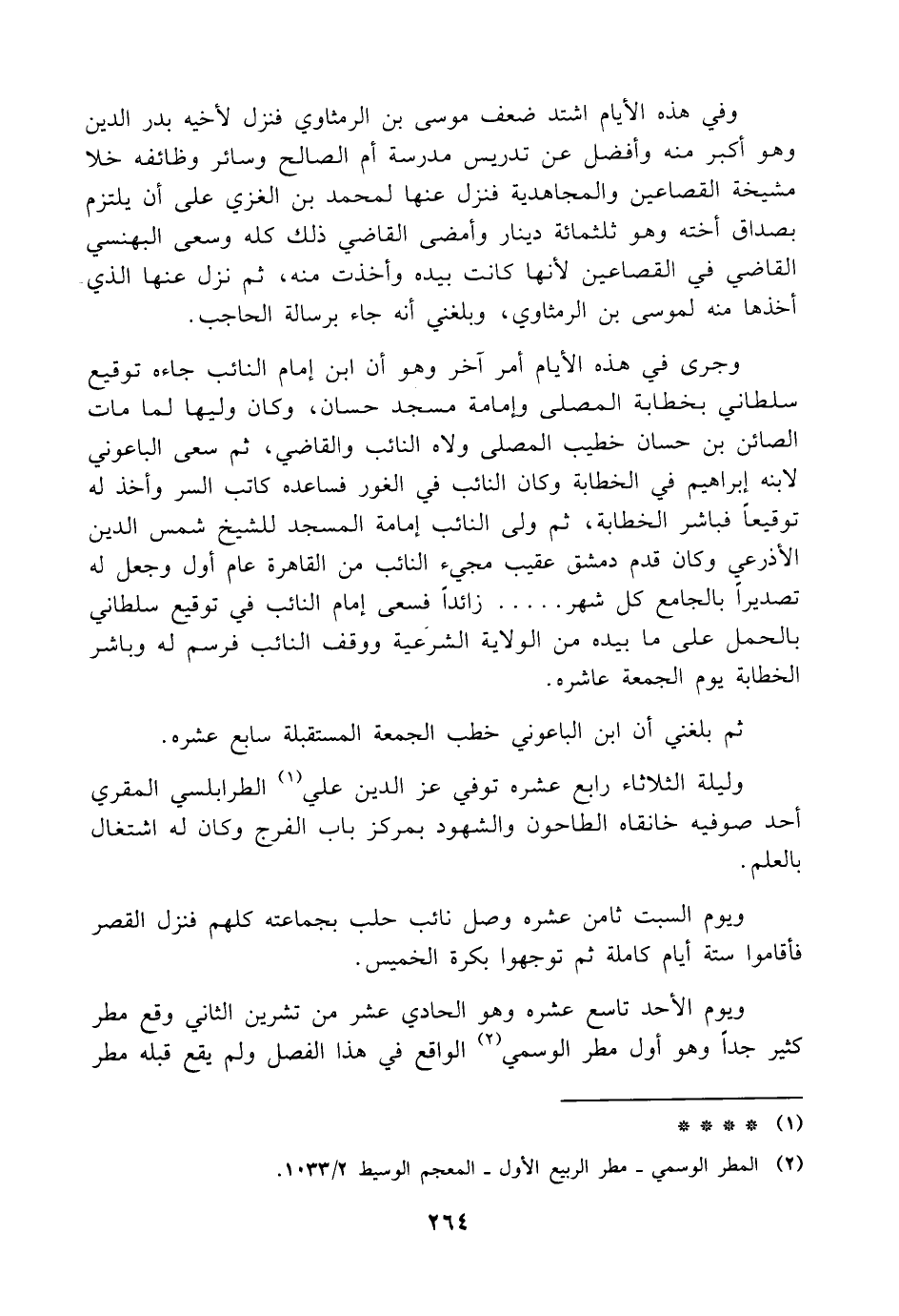 وفي هذه الأيام اشتد ضعف موسى بن الرمثاوي فنزل لأخيه بدر الدين وهو أكبر منه وأفضل عن تدريس مدرسة أم الصالح وسائر وظائفه خلا مشيخة القصاعين والمجاهدية فنزل عنها لمحمد بن الغزي على أن يلتزم بصداق أخته وهو ثلثمائة دينار وأمضى القاضي ذلك كله وسعى البهنسي القاضي في القصاعين لأنها كانت بيده وأخذت منه، ثم نزل عنها الذي أخذها منه لموسى بن الرمثاوي، وبلغني أنه جاء برسالة الحاجب.