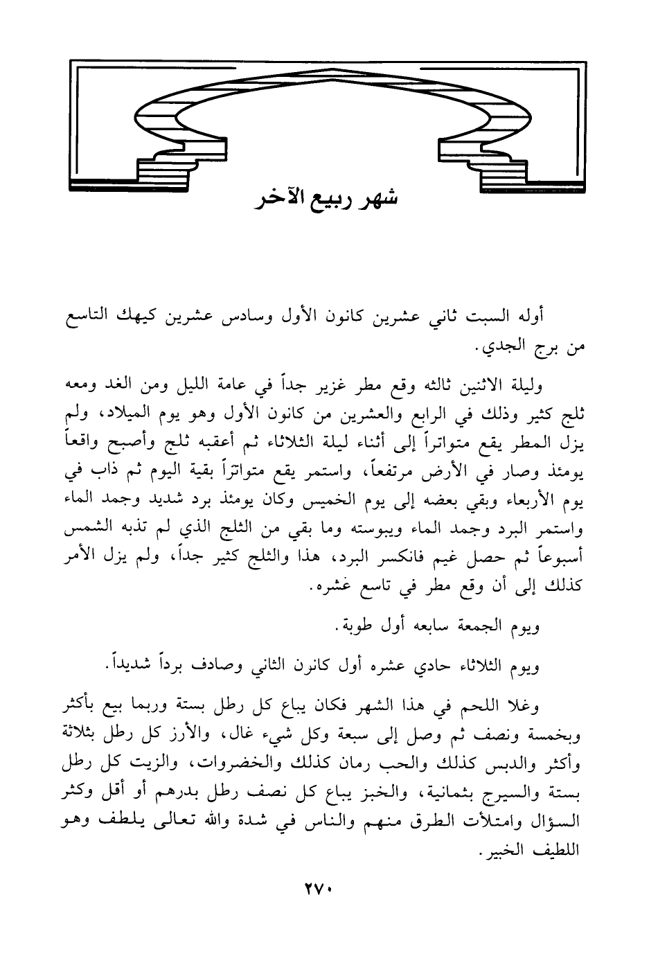 وليلة الاثنين ثالله وقع مطر غزير جدًا في عامة الليل ومن الغد ومعه ثلج كثير وذلك في الرابع والعشرين من كانون الأول وهو يوم الميلاد، ولى يزل المطر يقع متواترًا إلى أثناء ليلة الثلاثاء ثم أعقبه ثلج وأصبح واقعًا يومئذ وصار في الأرض مرتفعًا، واستمر يقع متواترًا بقية اليوم ثم ذاب في يوم الأربعاء وبقي بعضه إلى يوم الخميس وكان يومئذ برد شديد وجمد الماء واستمر البرد وجمد الماء ويبوسته وما بقي من الثلج الذي لم تذبه الشمس أسبوعًا ثم حصل غيم فانكسر البرد، هذا والثلج كثير جدًا، ولم يزل الأمر كذلك إلى أن وقع مطر في تاسع عشره.