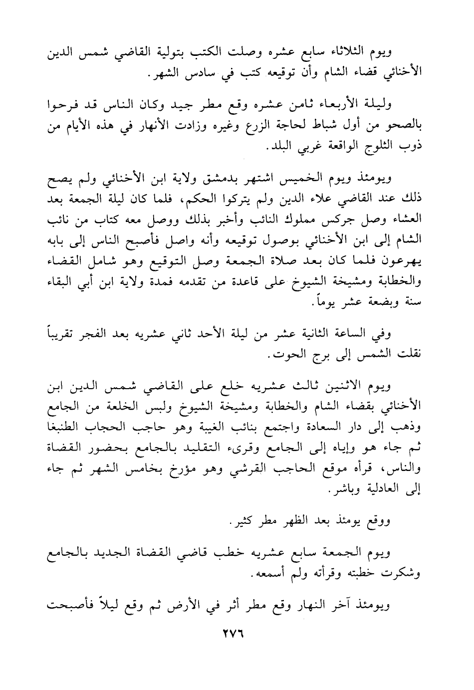 ويوم الثلاثاء سابع عشره وصلت الكتب بتولية القاضي شمس الدين الأخنائي قضاء الشام وأن توقيعه كتب في سادس الشهر.