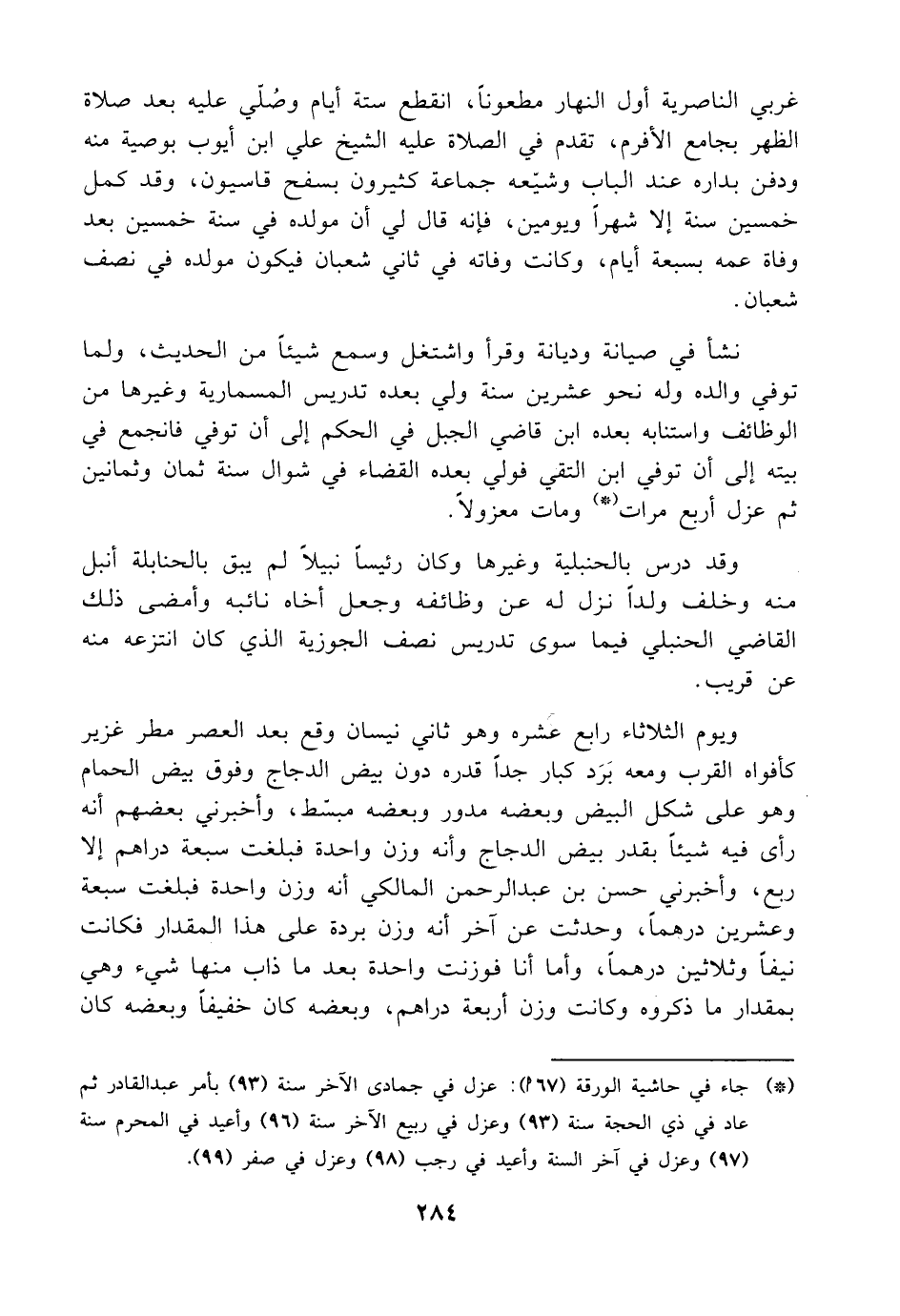 (*) جاء في حاشية الورقة (67 أ): عزل في جمادى الآخر سنة (93) بأمر عبد القادر ثم عاد في ذي الحجة سنة (93) وعزل في ربيع الآخر سنة (96) وأعيد في المحرم سنة (97) وعزل في آخر السنة وأعيد في رجب (98) وعزل في صفر (99).