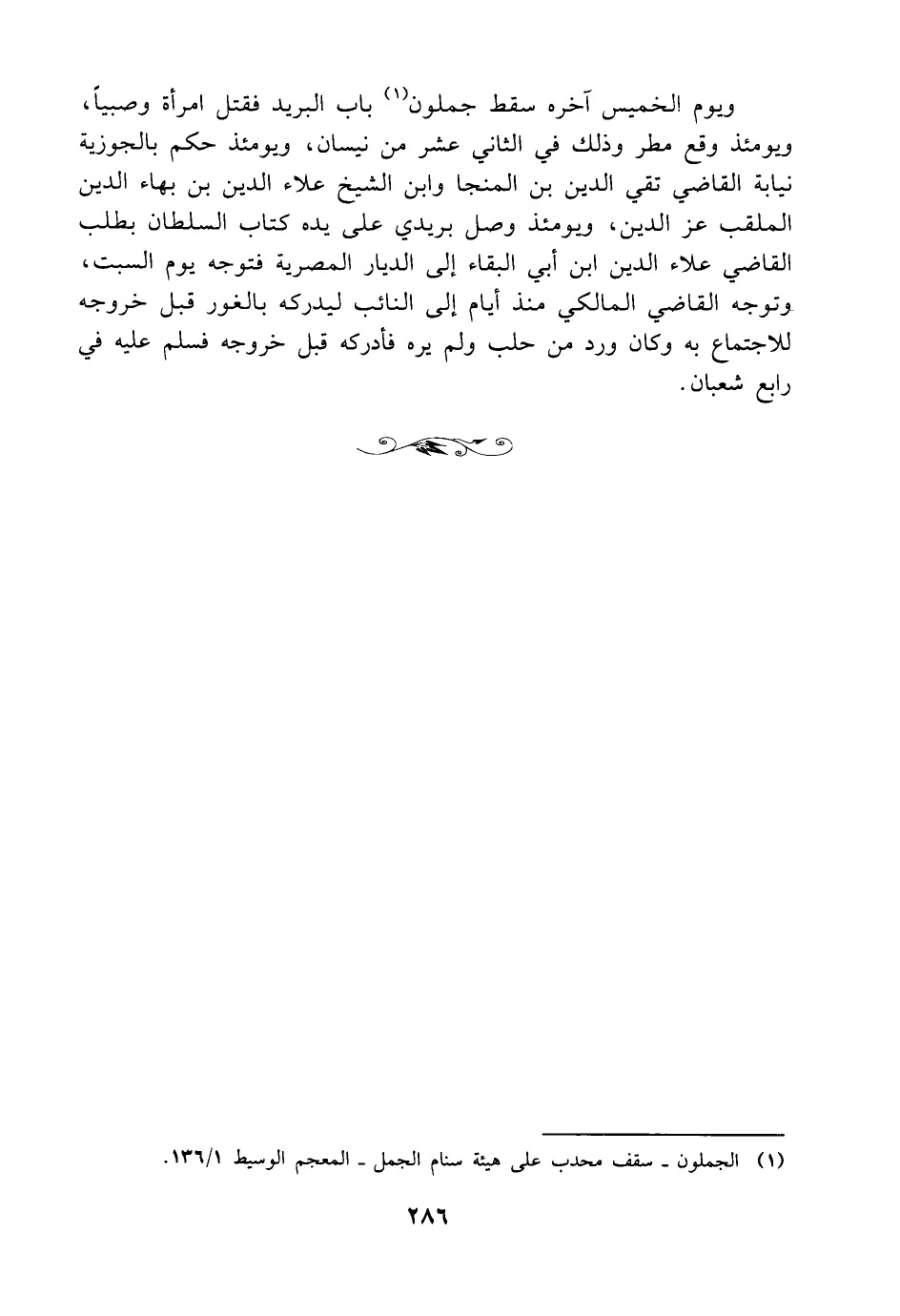 ويوم الخميس آخره سقط جملون (¬1) باب البريد فقتل امرأة وصبيًا، ويومئذ وقع مطر وذلك في الثاني عشر من نيسان، ويومئذ حكم بالجوزية نيابة القاضي تقي الدين بن المنجا وابن الشيخ علاء الدين بن بهاء الدين الملقب عز الدين، ويومئذ وصل بريدي على يده كتاب السلطان بطلب القاضي علاء الدين ابن أبي البقاء إلى الديار المصرية فتوجه يوم السبت، وتوجه القاضي المالكي منذ أيام إلى النائب ليدركه بالغور قبل خروجه للاجتماع به وكان ورد من حلب ولم يره فأدركه قبل خروجه فسلم عليه في رابع شعبان.