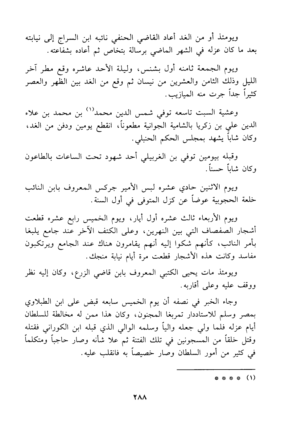 ويومئذ أو من الغد أعاد القاضي الحنفي نائبه ابن السراج إلى نيابته بعد ما كان عزله في الشهر الماضي برسالة بتخاص ثم أعاده بشفاعته.
